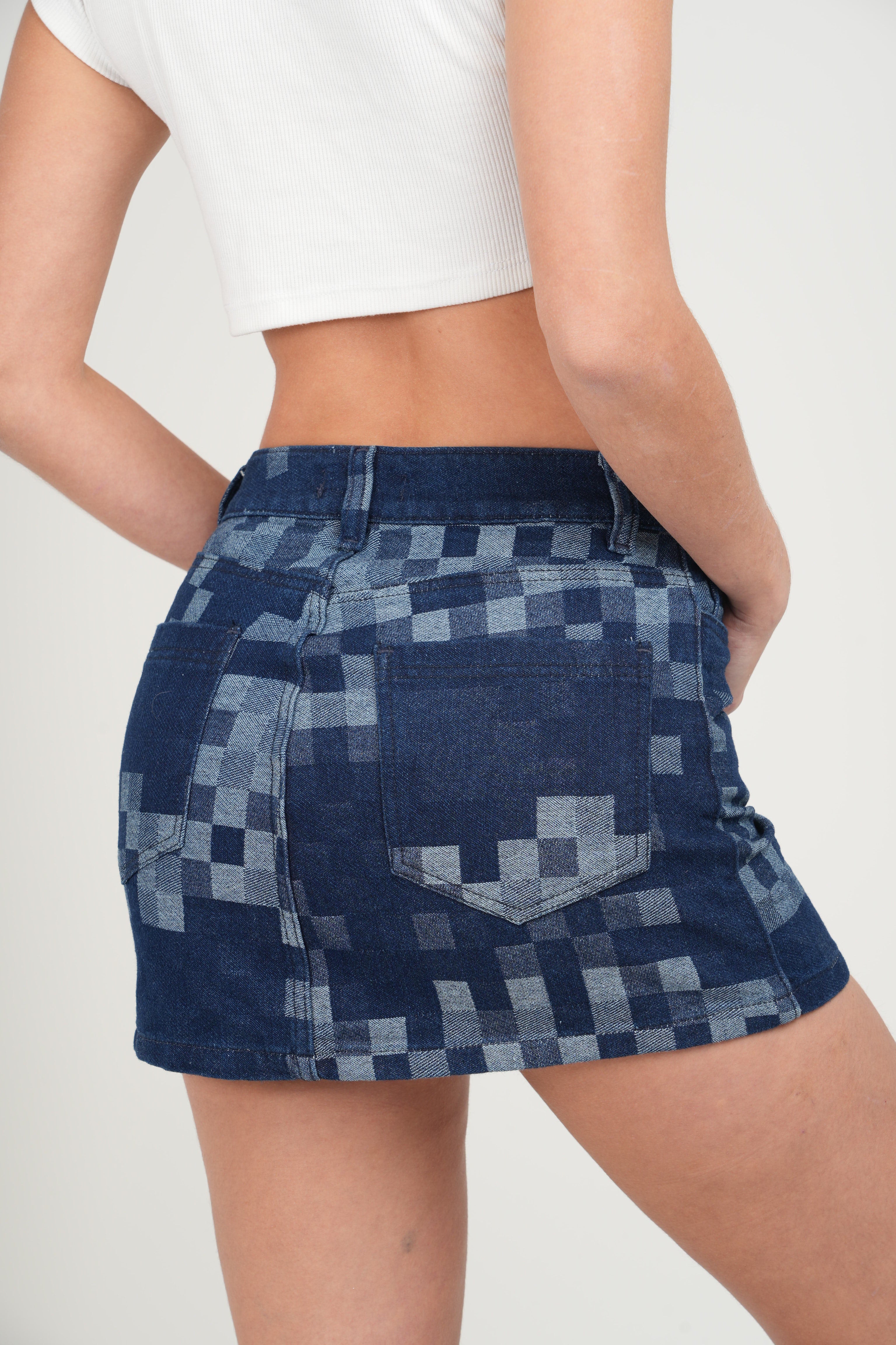 Falda Mini Denim Cuadros – Estilo Urbano con Toque Retro. Eleva tu look con esta falda mini en denim oscuro, diseñada para destacar. Su detalle de estampado a cuadros degradado en la parte inferior le da un aire moderno y versátil, perfecto para crear outfits casuales con un toque fashionista.