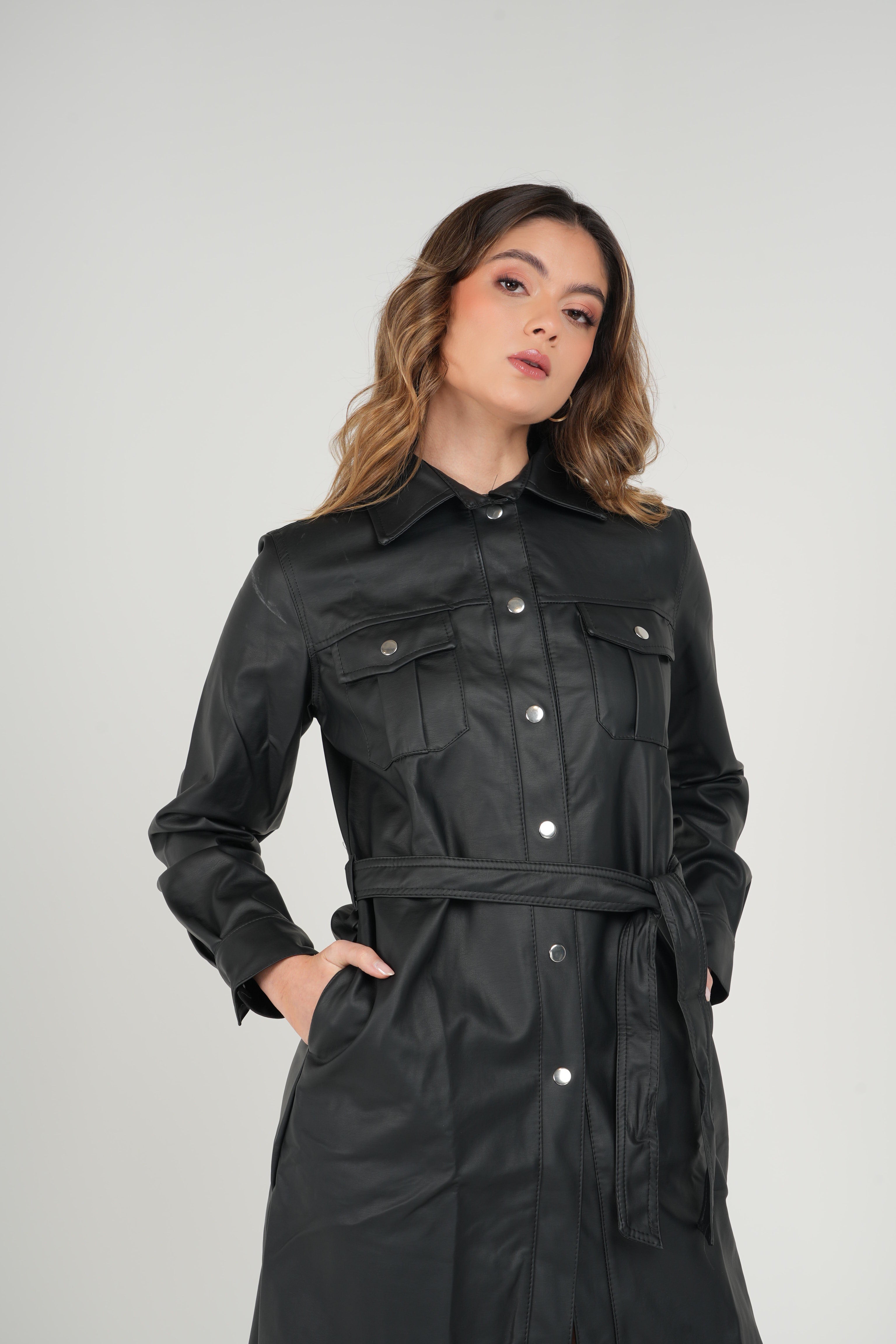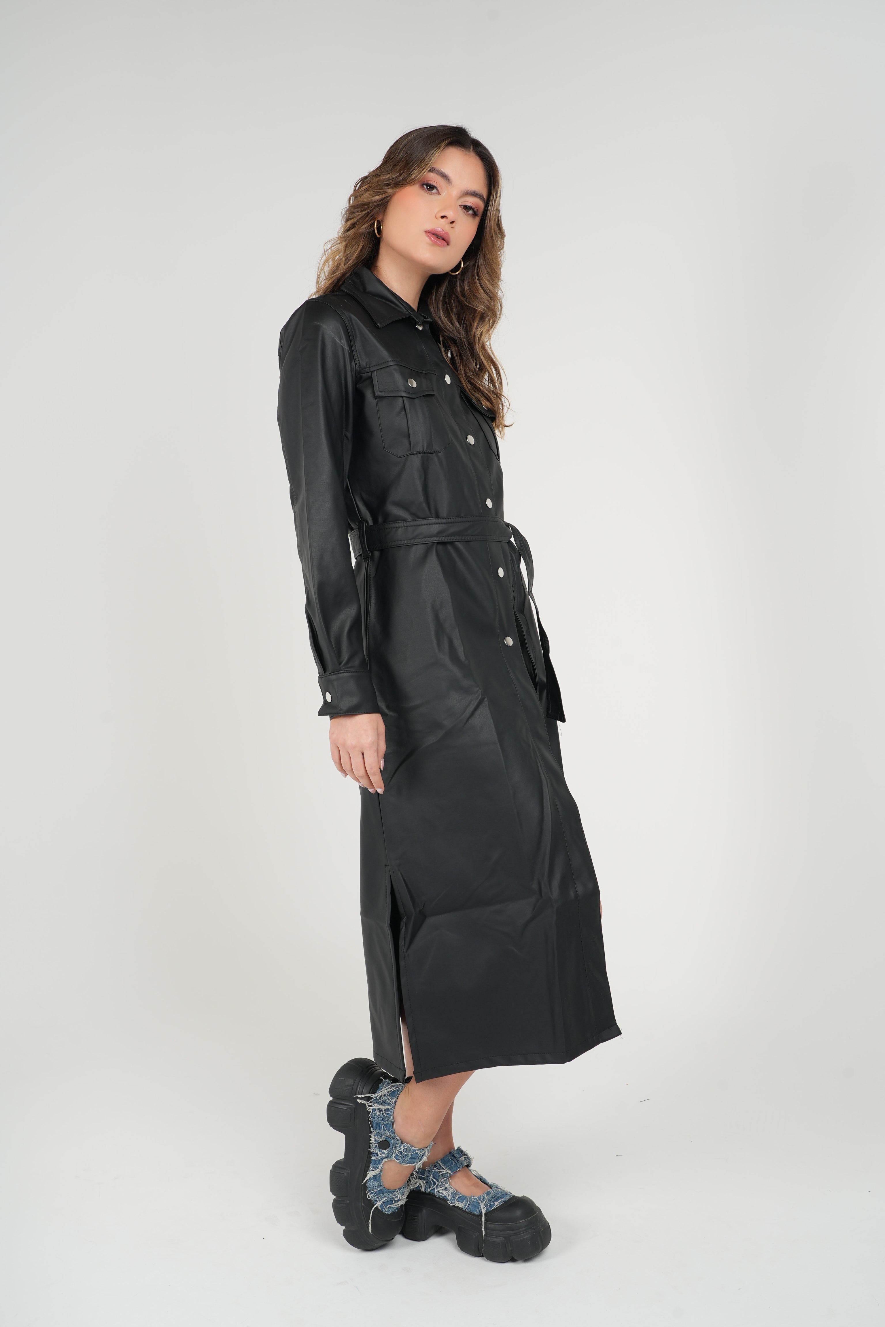 Eleva tu estilo con este vestido largo tipo trench de cuerina negra, una prenda versátil y poderosa que fusiona elegancia con actitud urbana. Su diseño estructurado con botones frontales, cuello clásico y bolsillos funcionales crea una silueta estilizada ideal para looks de impacto. Su corte largo estiliza la figura, mientras que el ajuste fluido permite total comodidad.