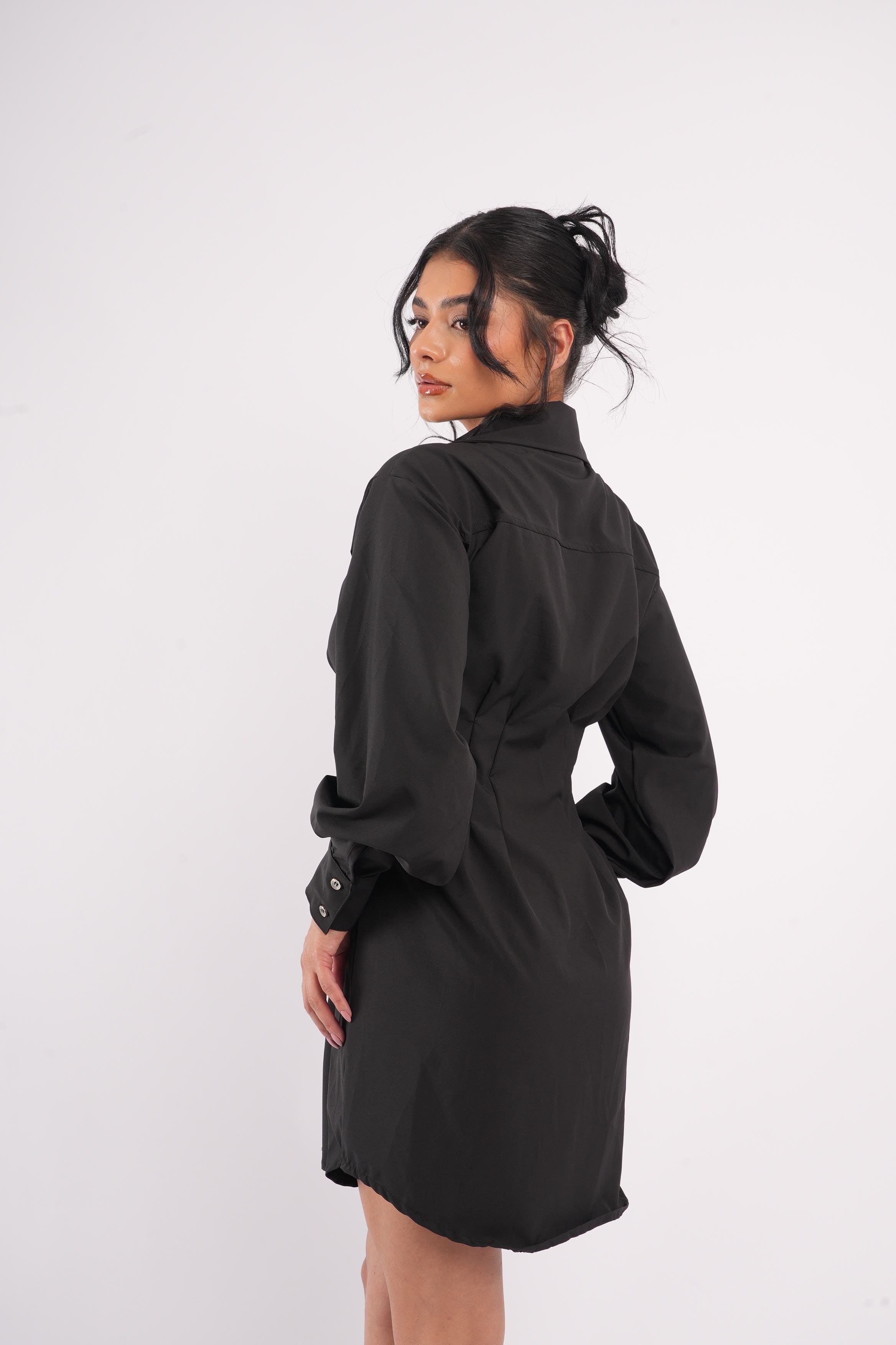 Vestido camisero negro de mujer con manga larga y botones frontales. Ideal para oficina, salidas casuales o noches elegantes. Combina estilo, comodidad y versatilidad en una sola prenda.