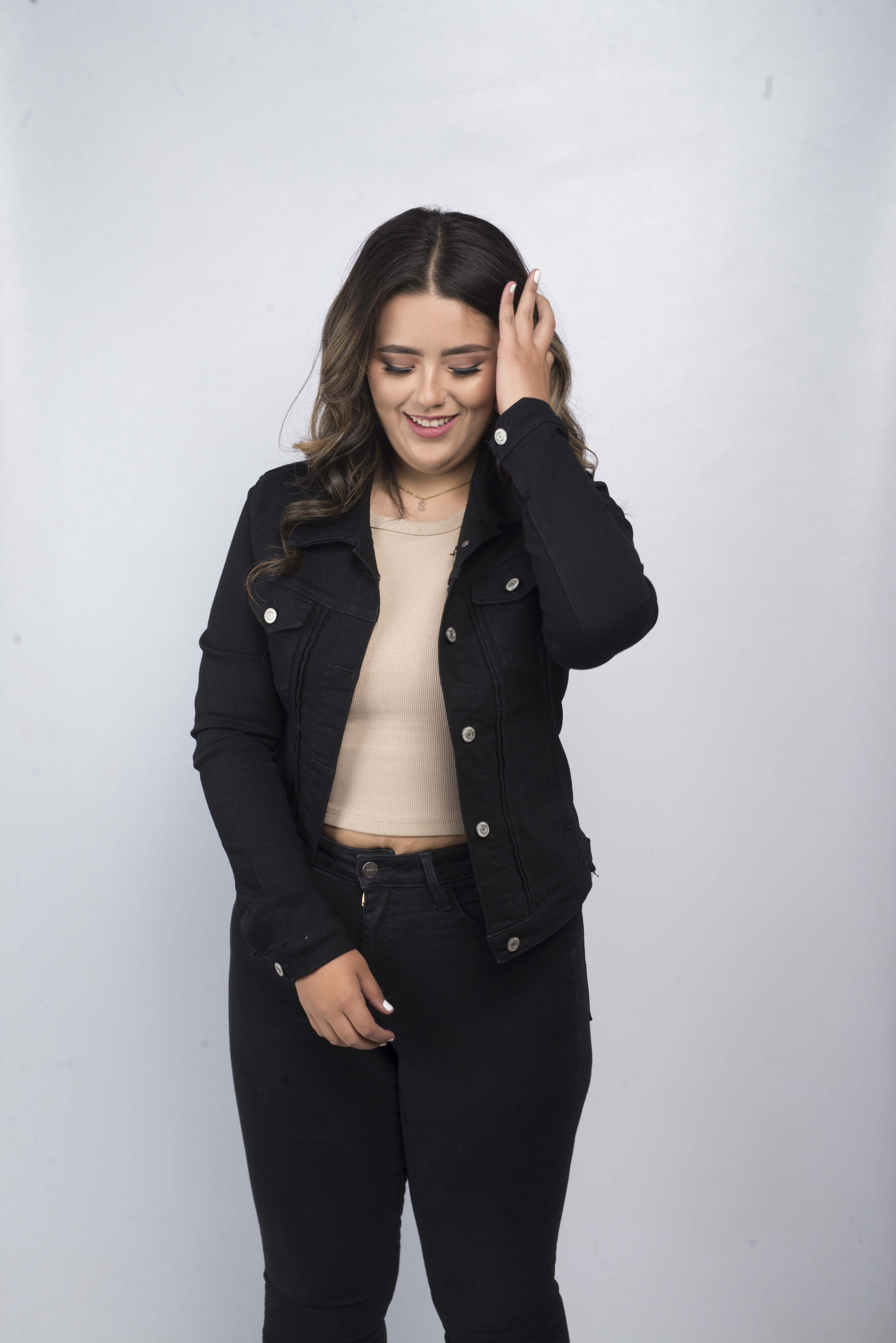 Chaqueta licrada negra para mujer, con diseño ajustado y bolsillos frontales. Moderna y versátil, ideal para outfits urbanos y casuales.