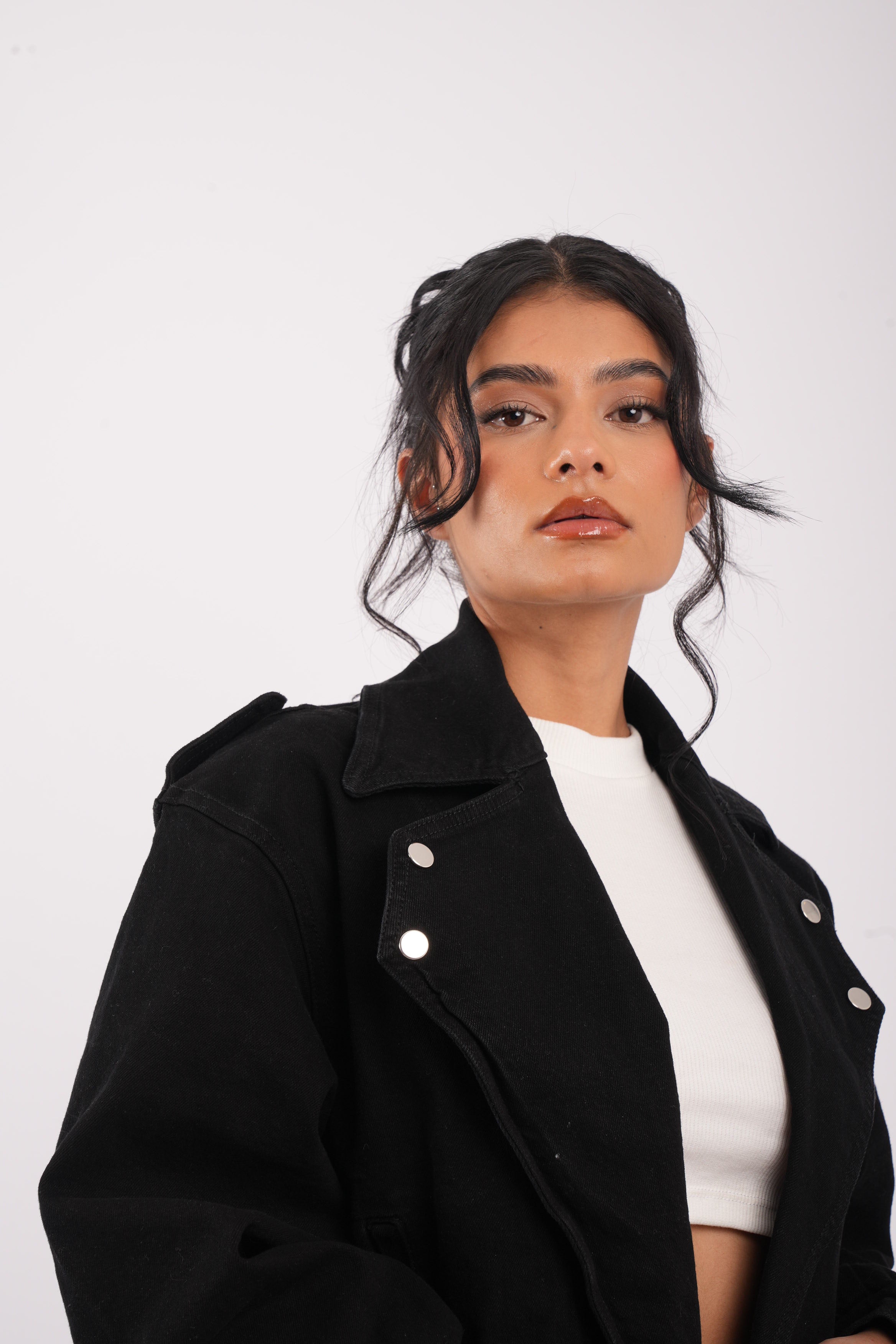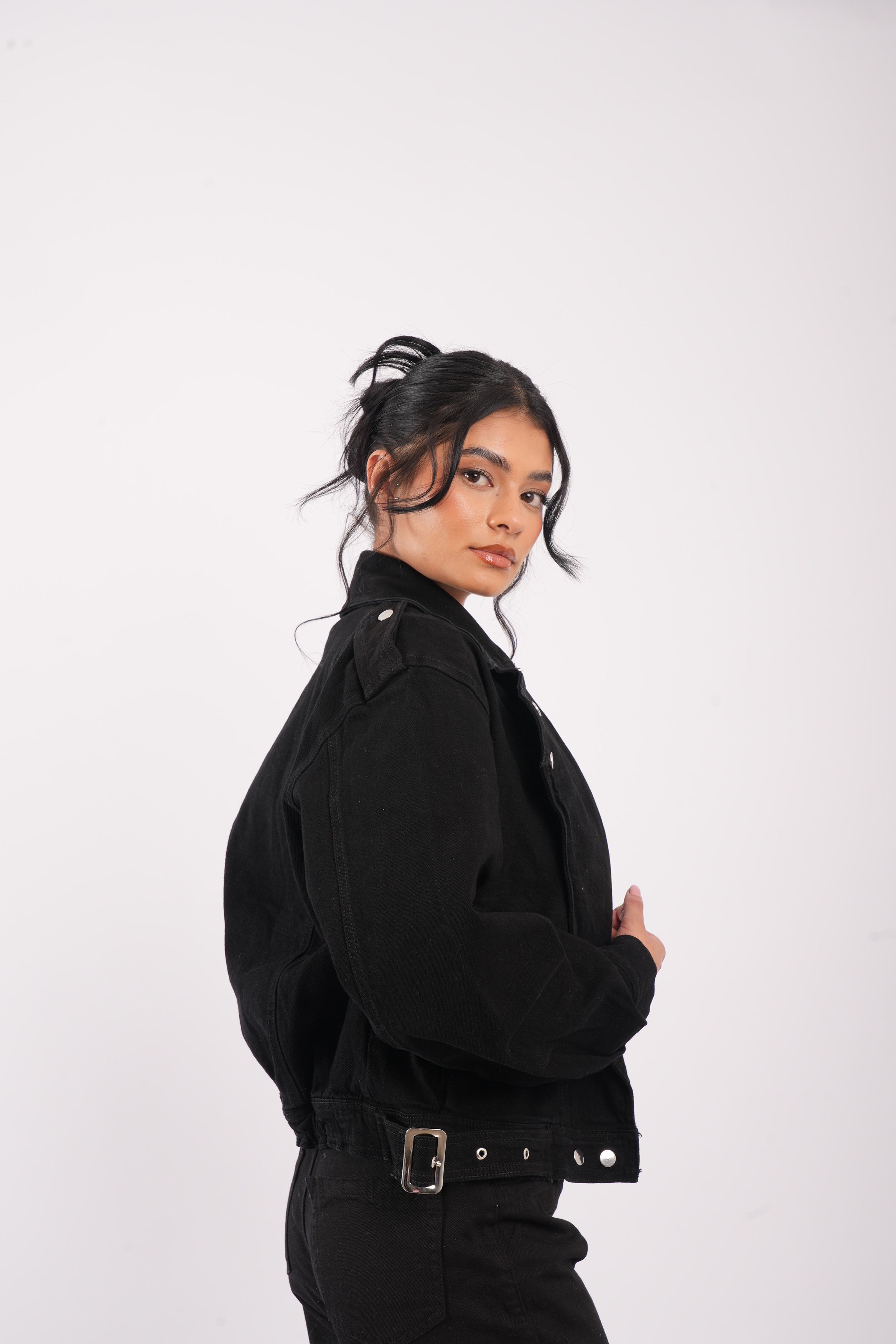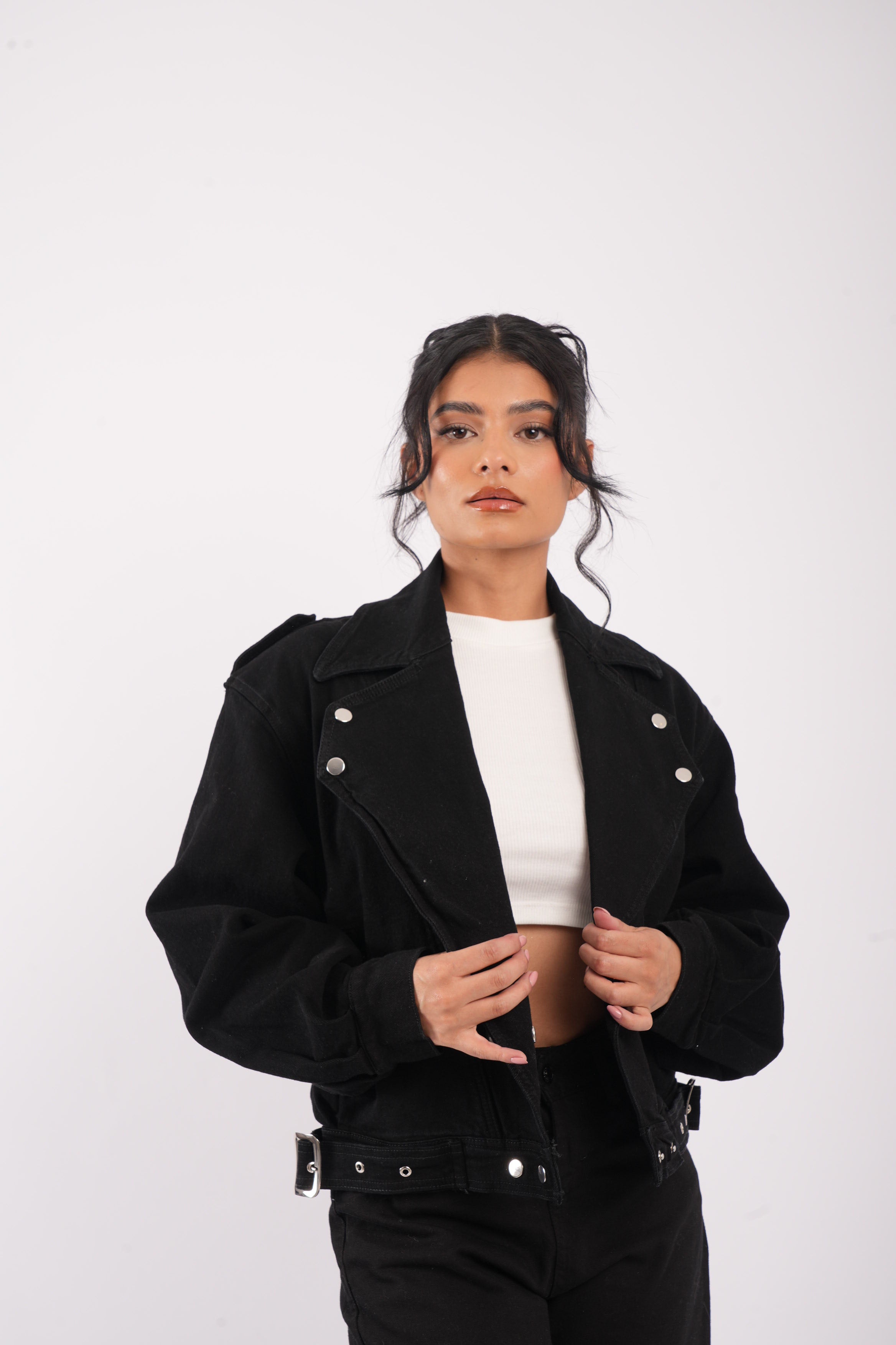 Chamarra biker negra en denim con hebillas – Estilo urbano y sofisticado Atrévete a destacar con esta chamarra negra estilo biker, confeccionada en denim de alta calidad. Su diseño estructurado con solapas amplias, botones metálicos y hebillas laterales aporta un toque moderno y rebelde que transforma cualquier outfit básico en un look poderoso.