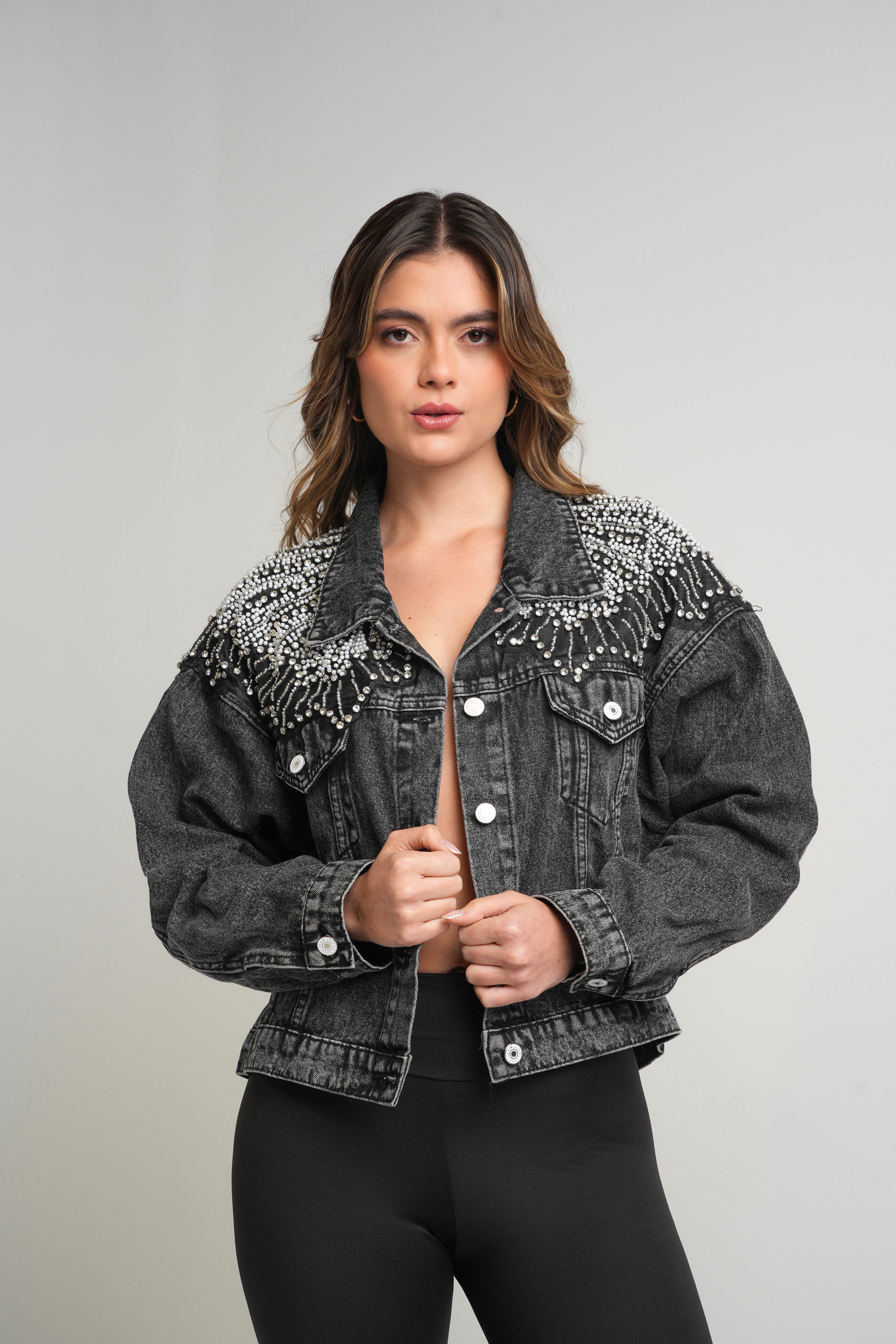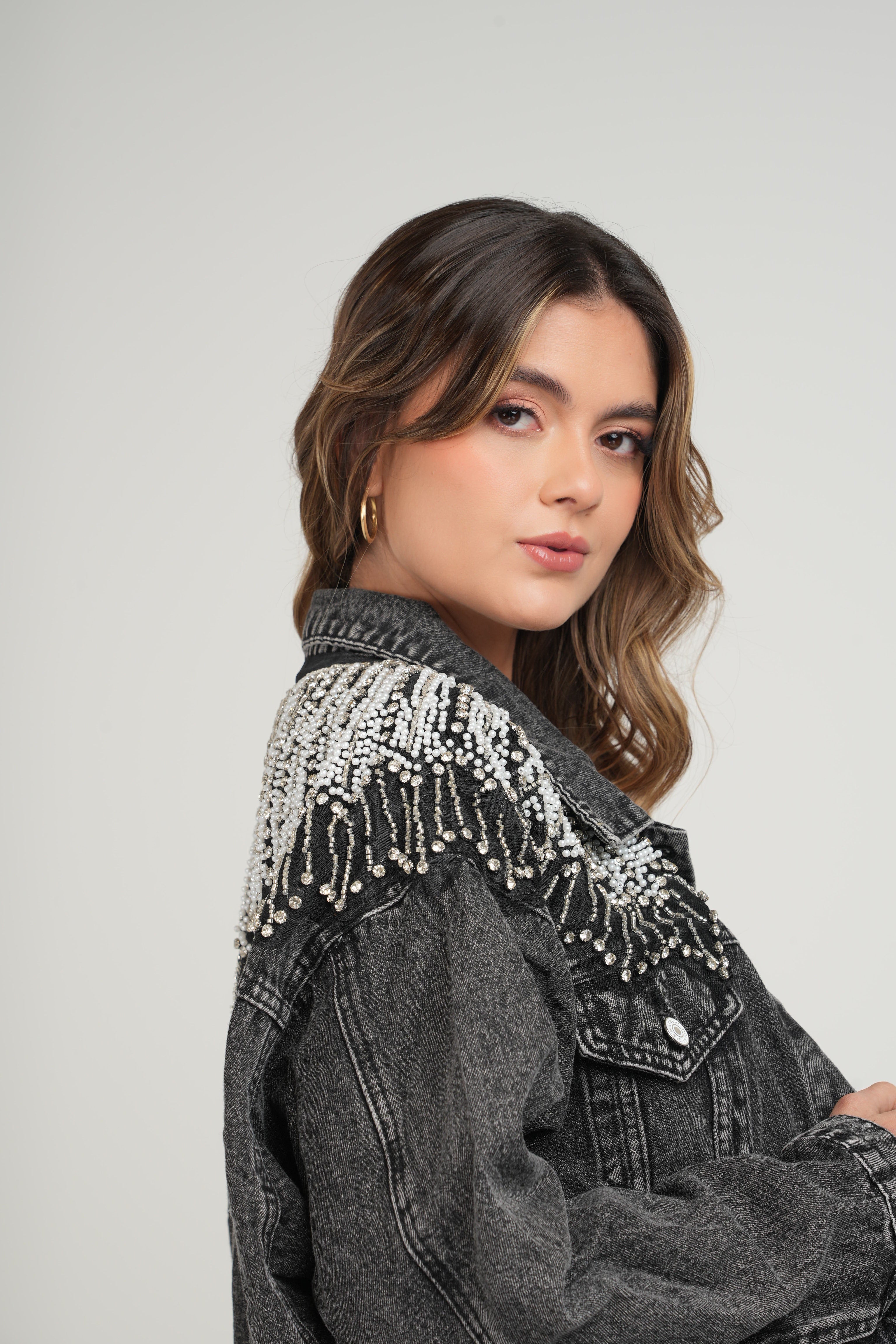 La chaqueta denim negra con perlas y aplicaciones brillantes es una pieza única que combina la fuerza del denim con la elegancia de los detalles artesanales. Diseñada para destacar, incorpora una composición de perlas y brillos en cascada sobre los hombros, creando un efecto visual glamuroso y sofisticado.