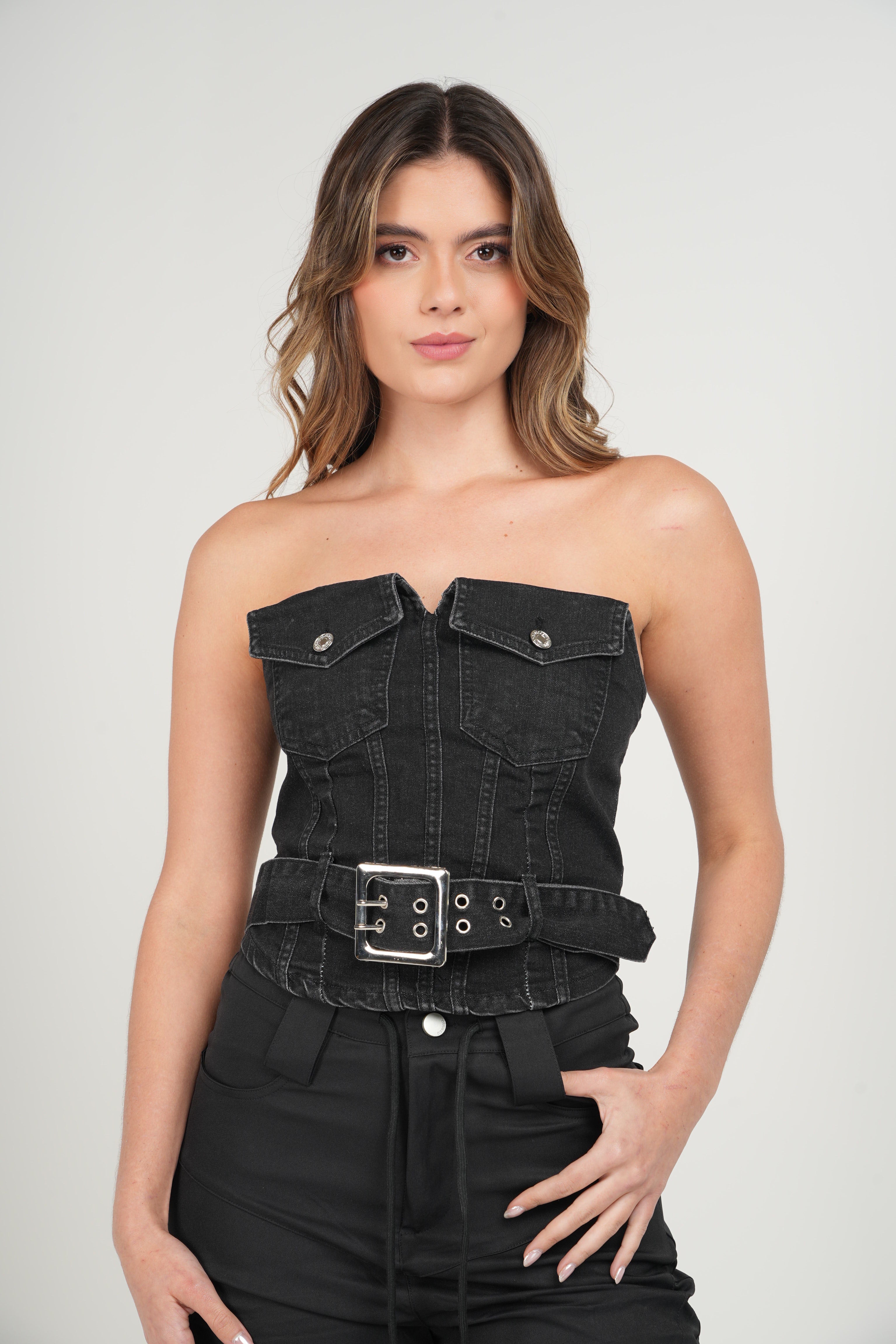 El corset negro tipo strapless es una pieza clave para resaltar la silueta con actitud y estilo. Su diseño estructurado en denim oscuro con varillas y costuras visibles moldea la figura, mientras que el cinturón con hebilla metálica define la cintura y aporta un toque moderno y rebelde.