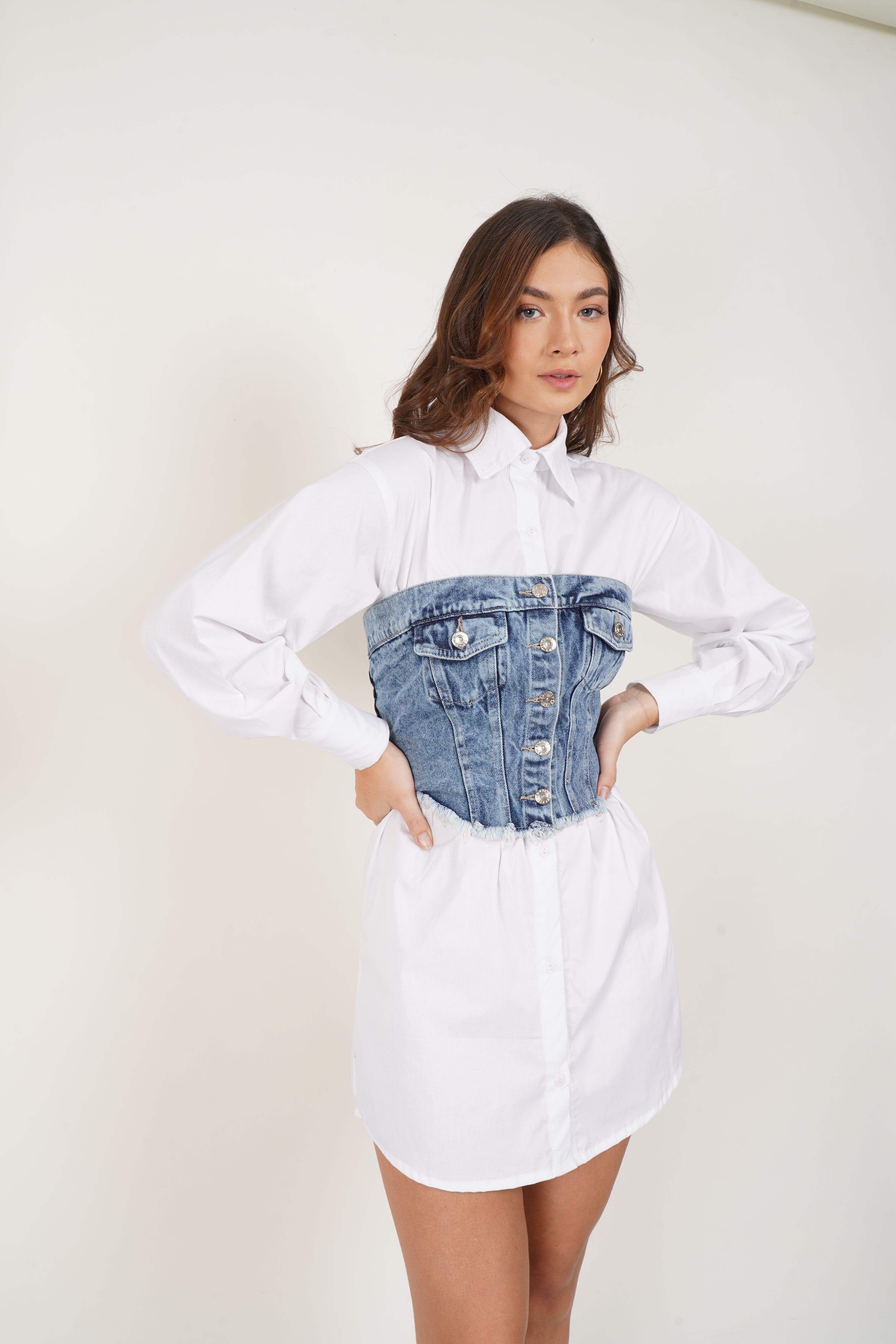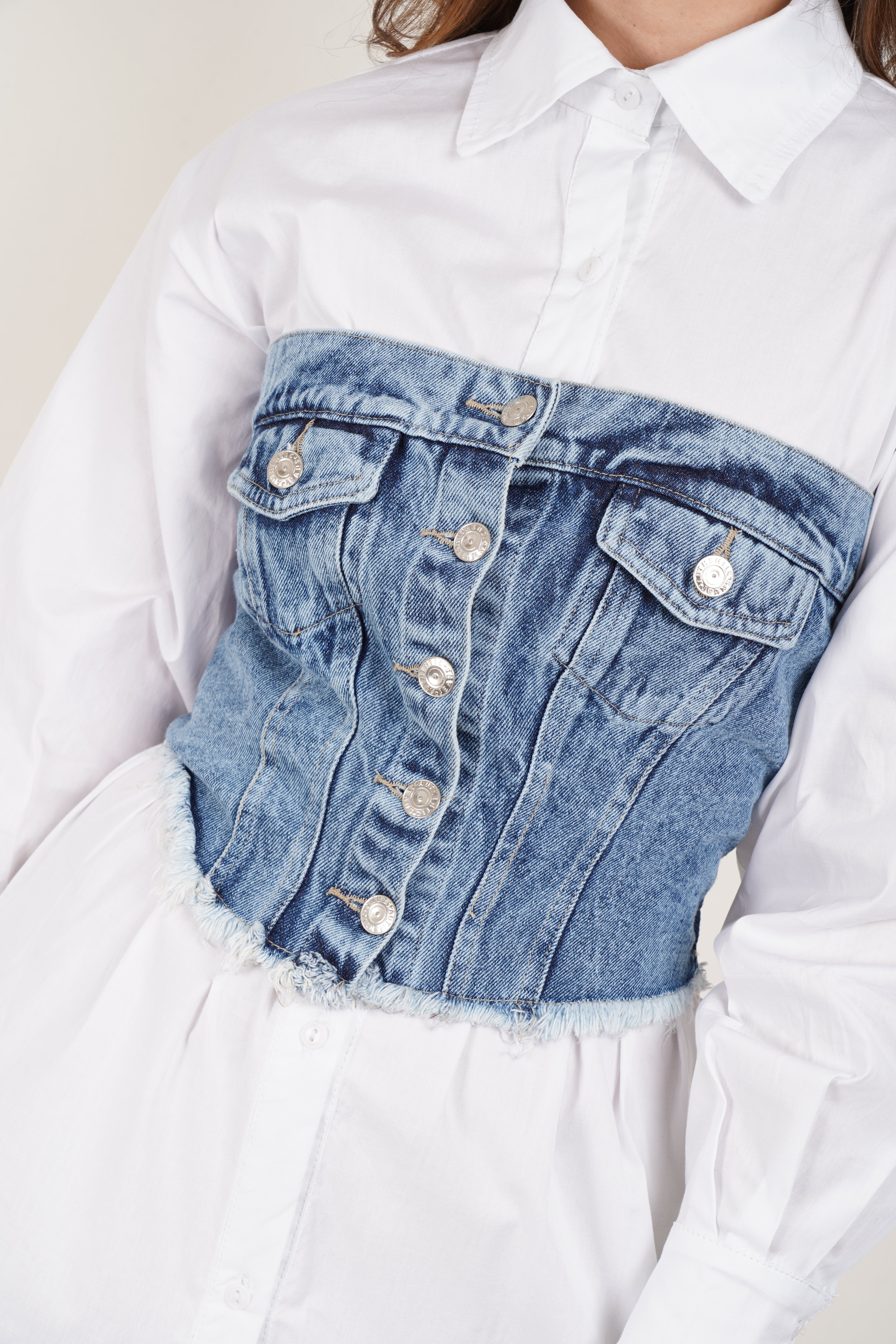 Corset de jean azul para mujer, estilo strapless con botones frontales y detalle desflecado. Espalda con resorte para mejor ajuste y comodidad.