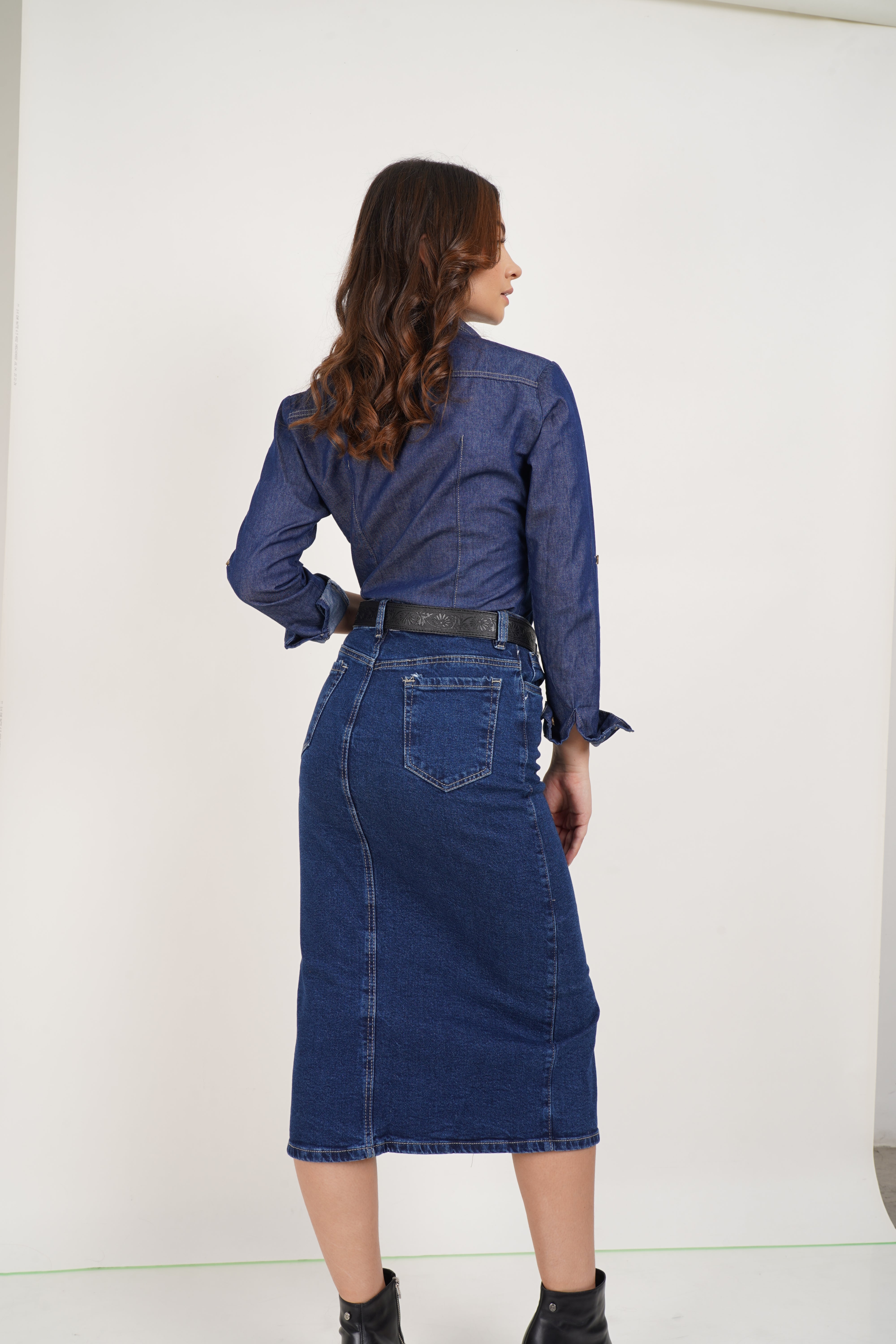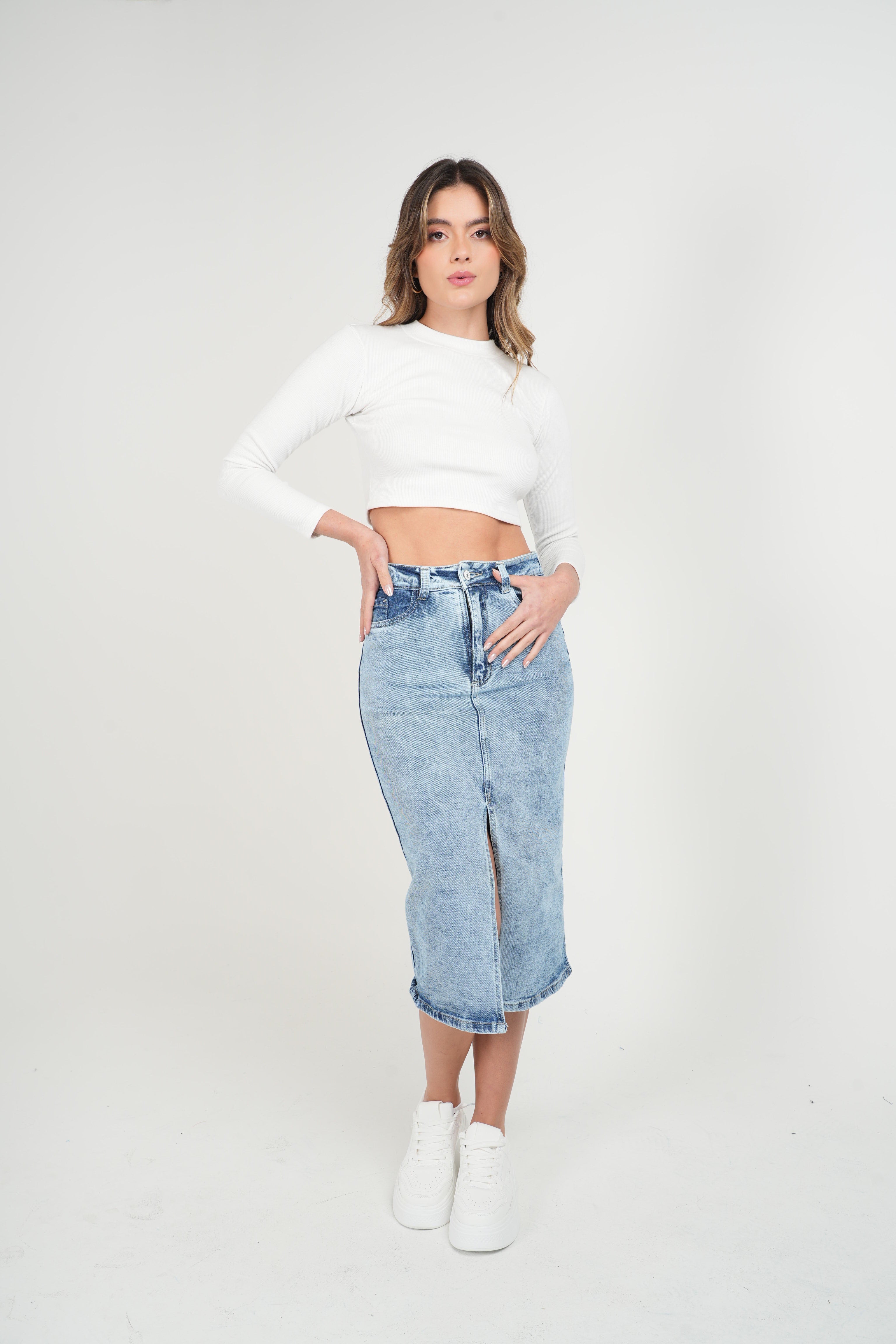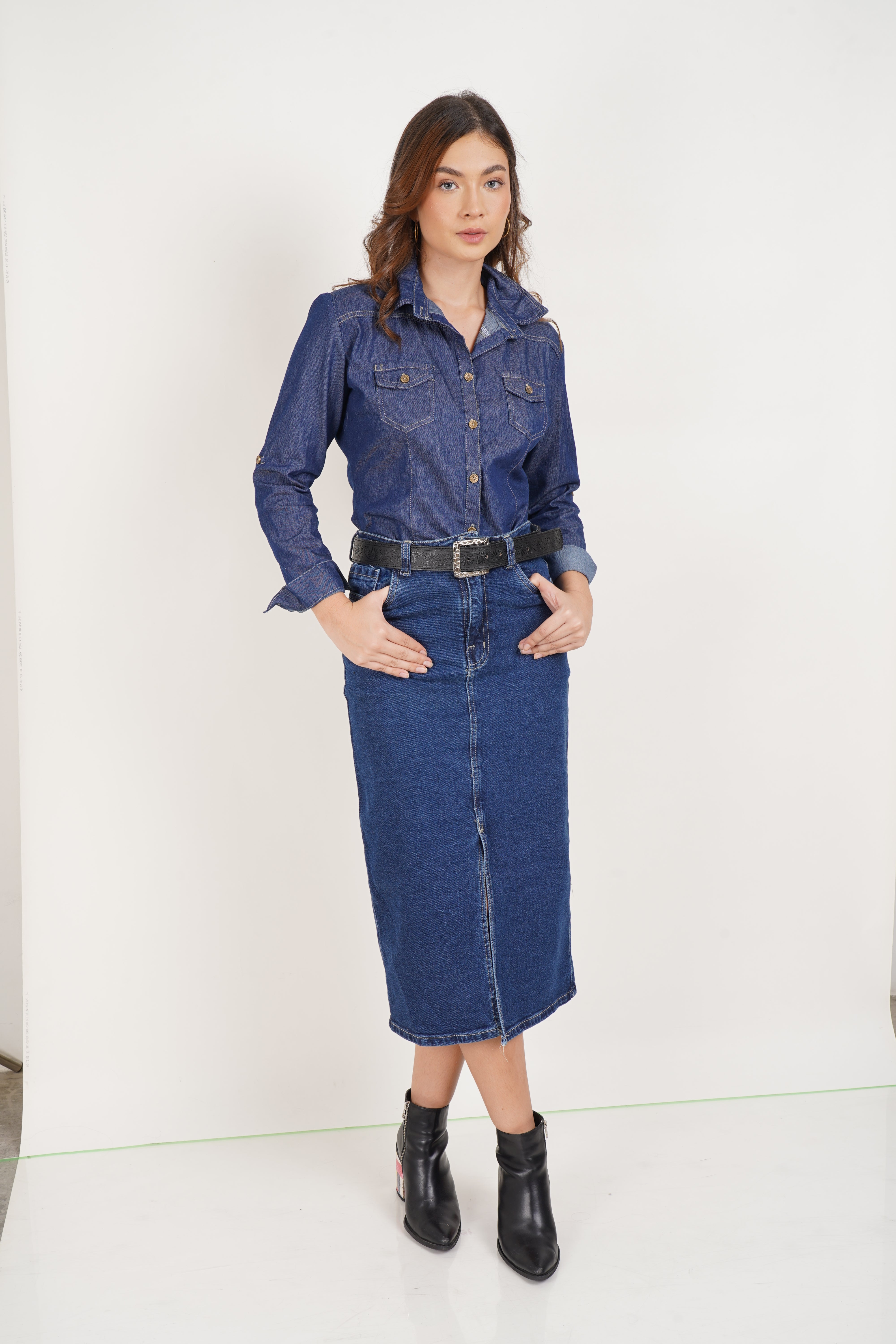 Falda Midi en Denim Azul con Abertura Frontal – Estilo Clásico y Femenino. Eleva tus outfits con esta falda midi en denim, perfecta para crear looks versátiles y con mucha personalidad. Su diseño recto estiliza la figura, mientras que la abertura frontal aporta un toque moderno y cómodo al caminar. Ideal para combinar con camisas, crop tops o chaquetas para cualquier ocasión.