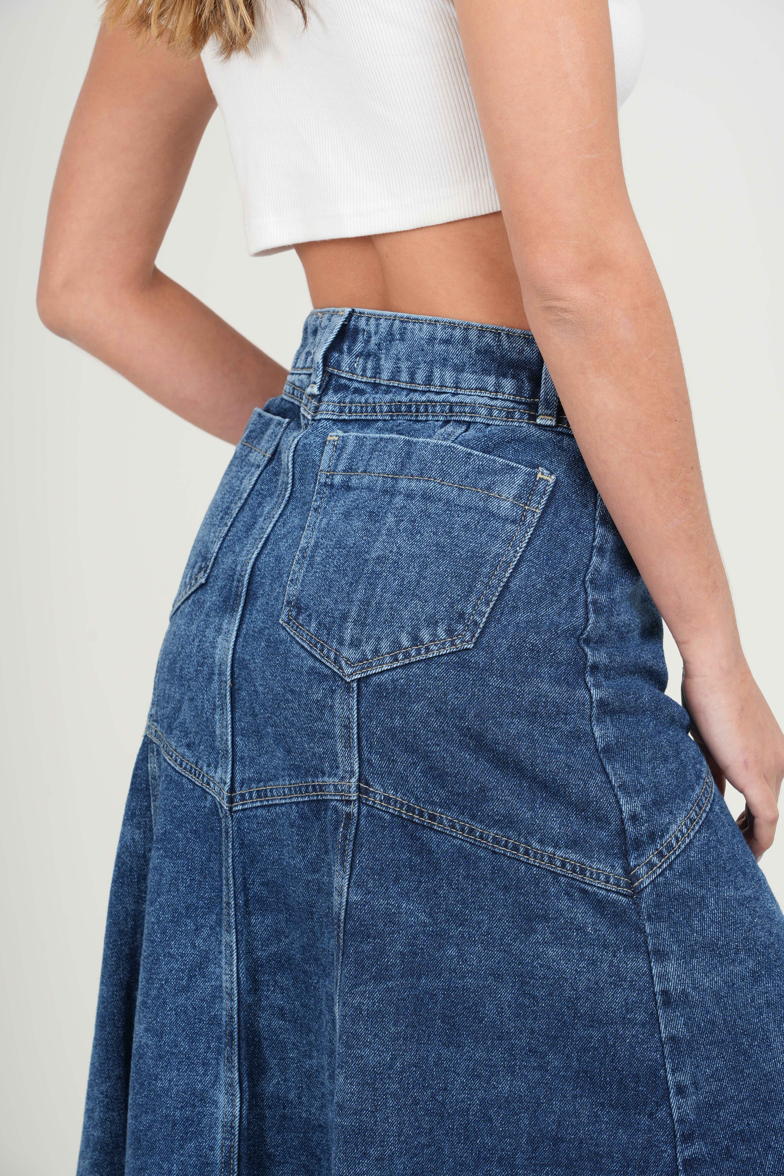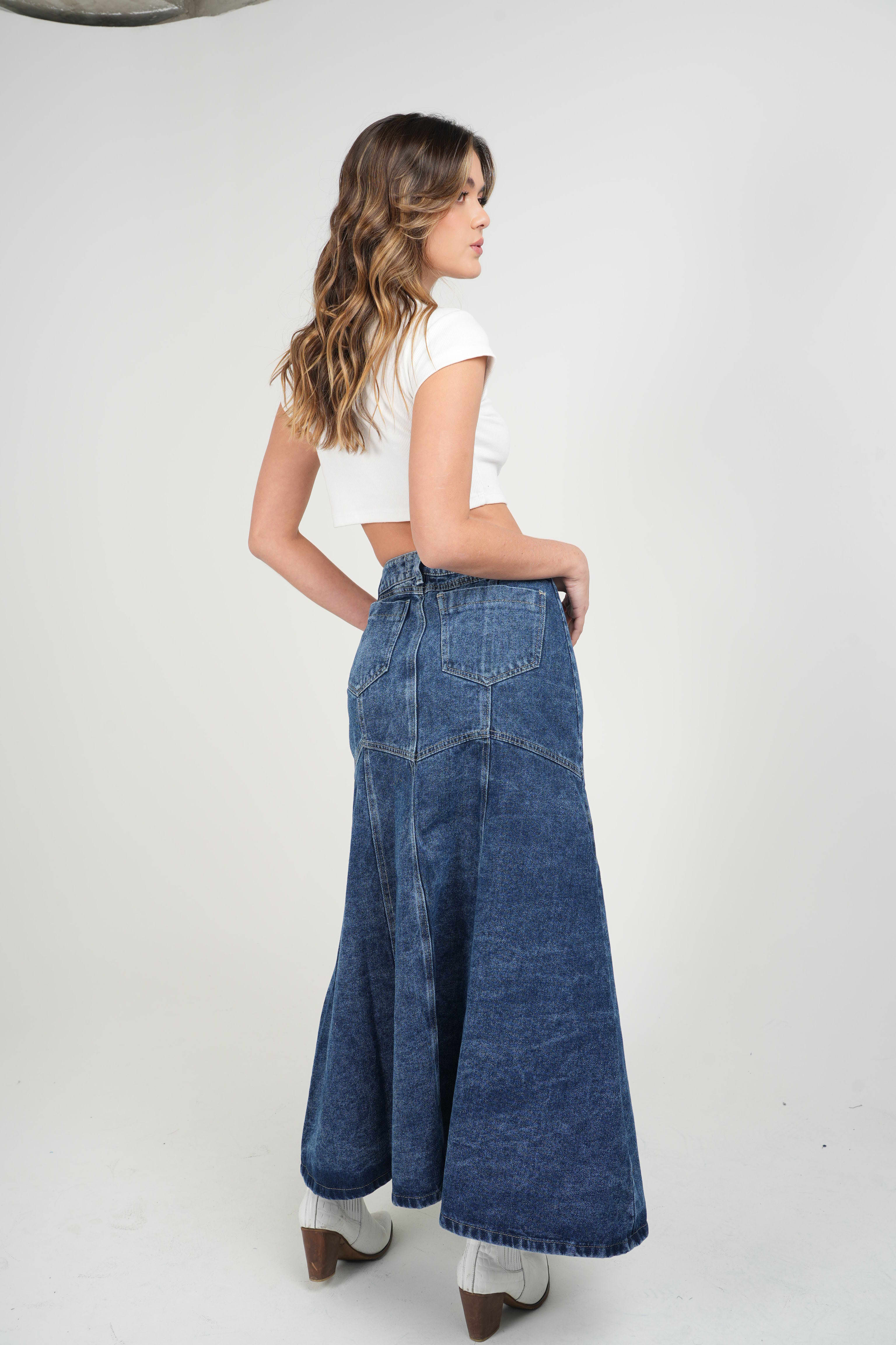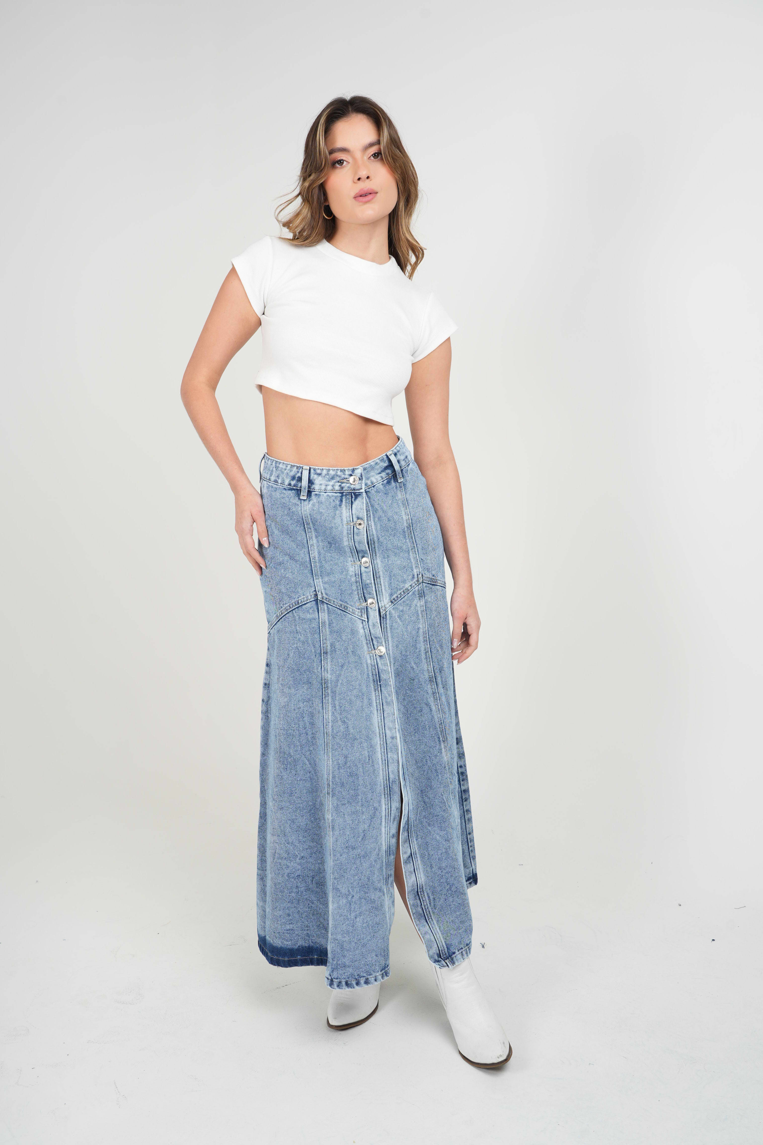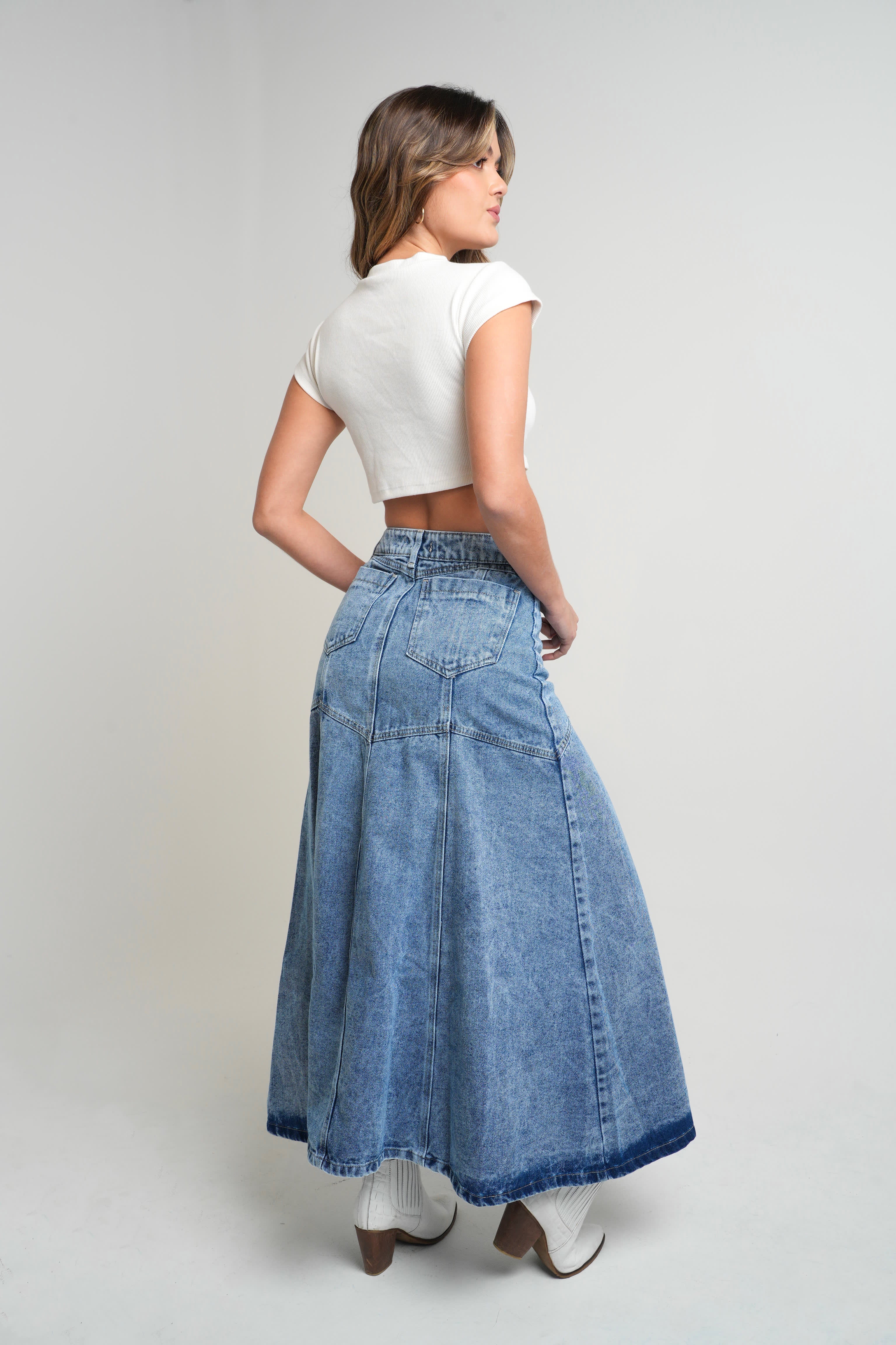 Falda larga en denim con botones frontales — Estilo vintage moderno.Eleva tus looks con esta falda maxi en denim azul, diseñada con silueta amplia y caída elegante que estiliza la figura. Su confección en mezclilla de alta calidad ofrece resistencia y comodidad, perfecta para combinar en cualquier temporada. Presenta un diseño con botones frontales funcionales, corte en “V” que realza la cintura y prácticos bolsillos traseros, dándole un toque auténtico y versátil. Ideal para crear outfits casuales, western o boho chic: combínala con tops cortos, camisas básicas o chaquetas denim para un total look lleno de estilo.