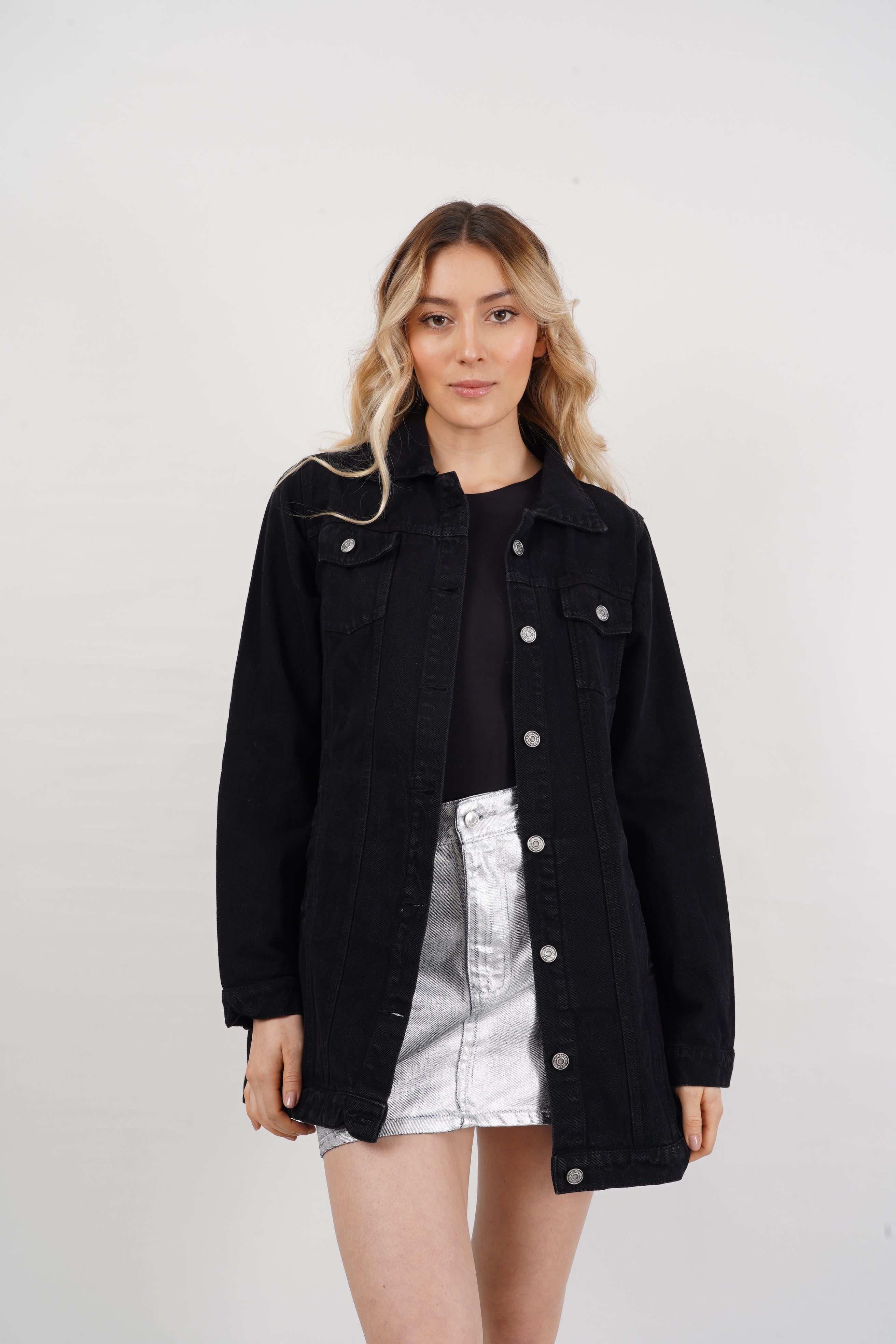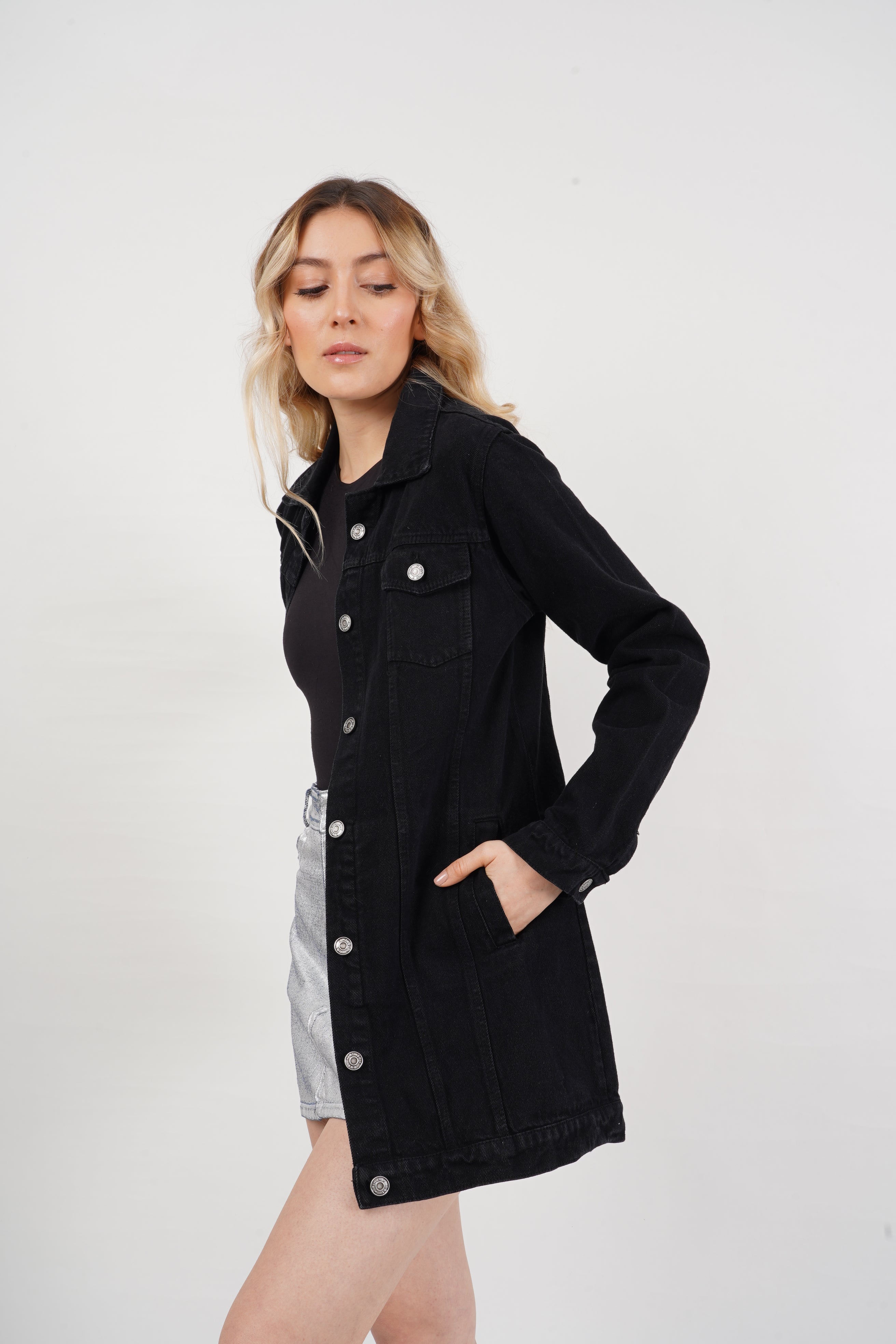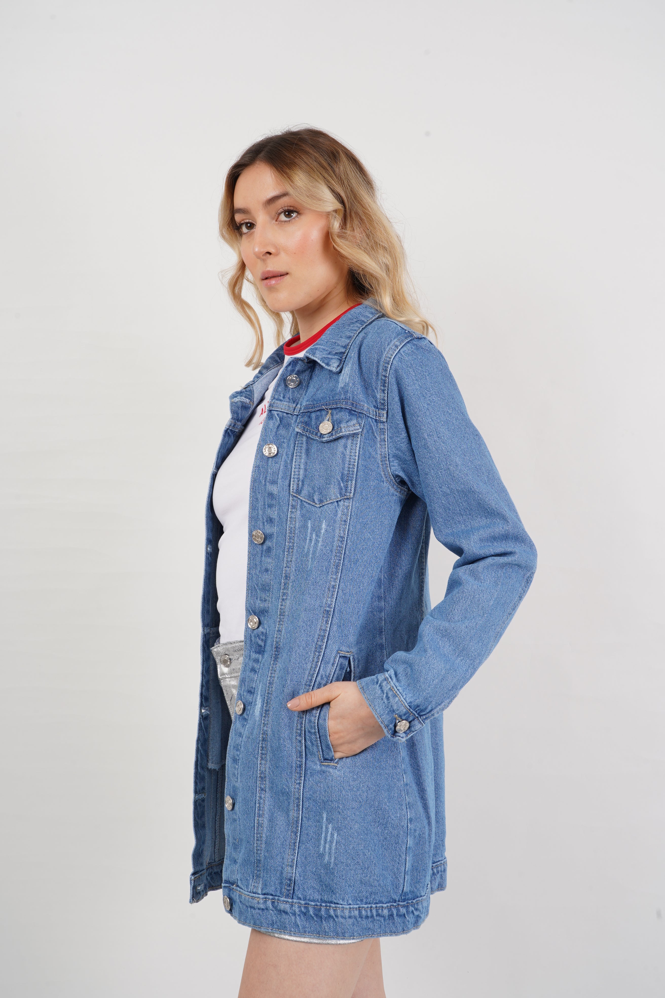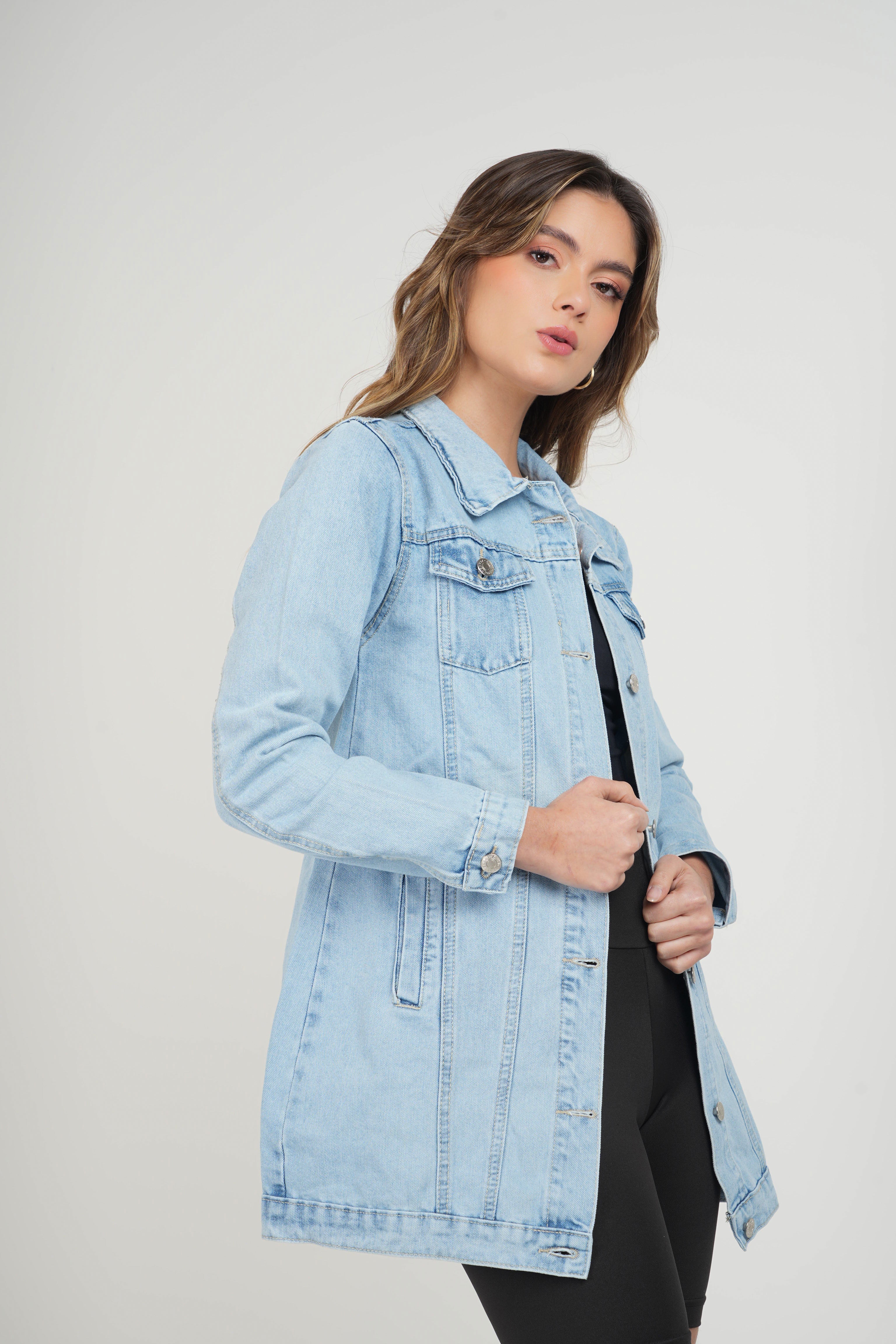 Chaqueta larga de jean para mujer, con botones metálicos y bolsillos frontales. Versátil y moderna, perfecta para looks casuales y urbanos.
