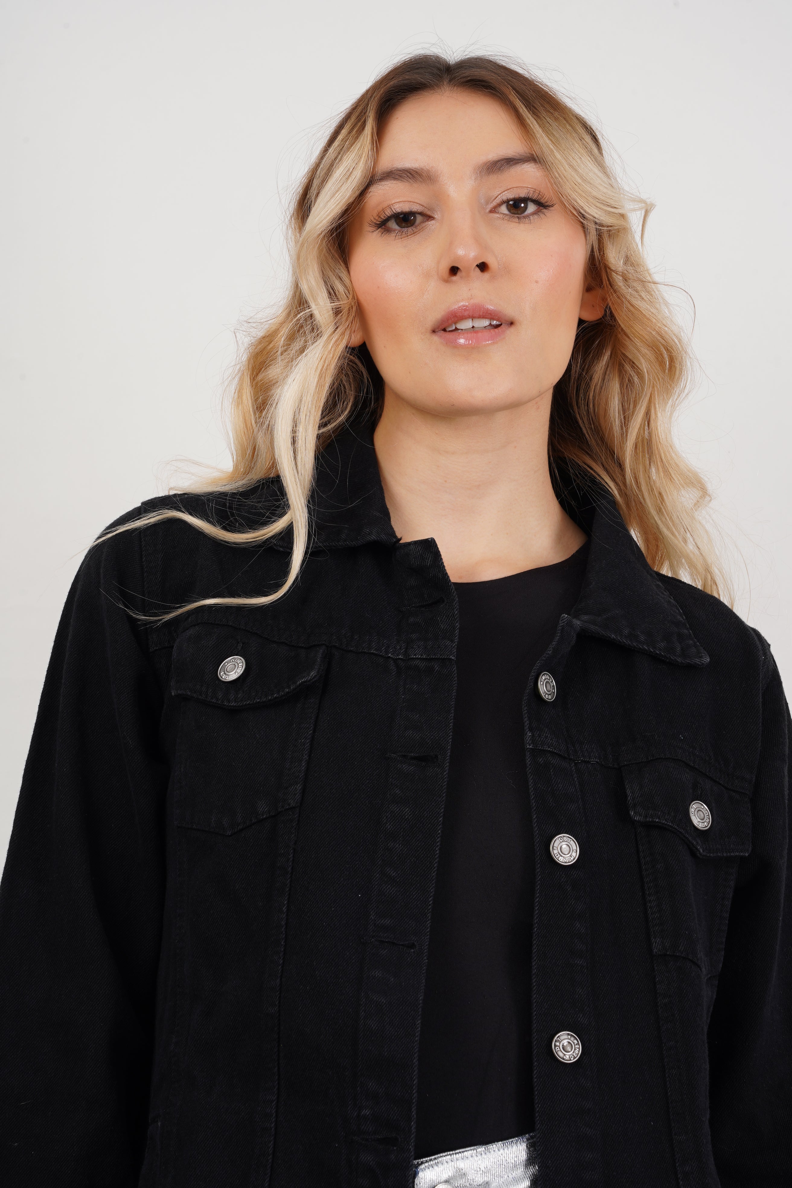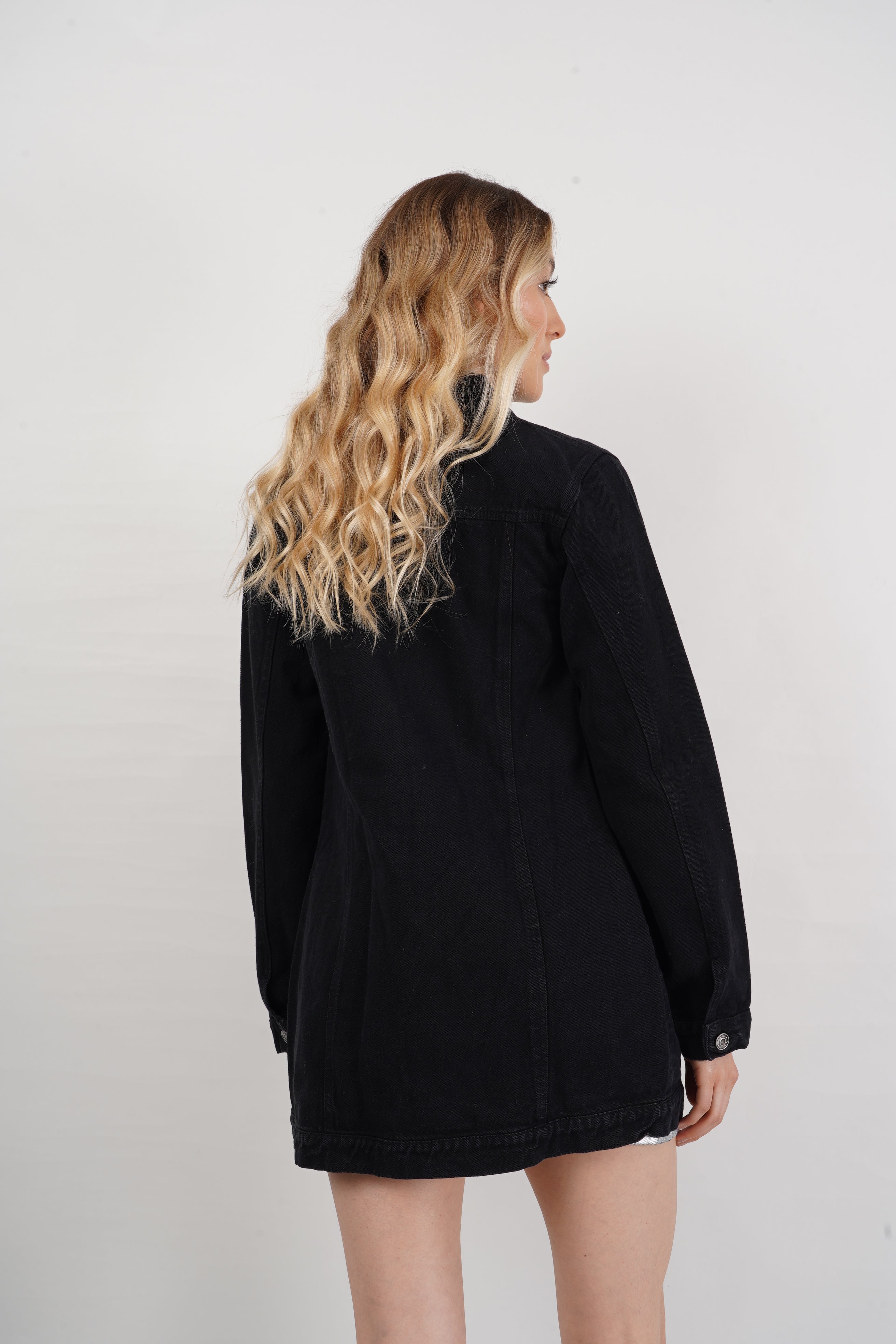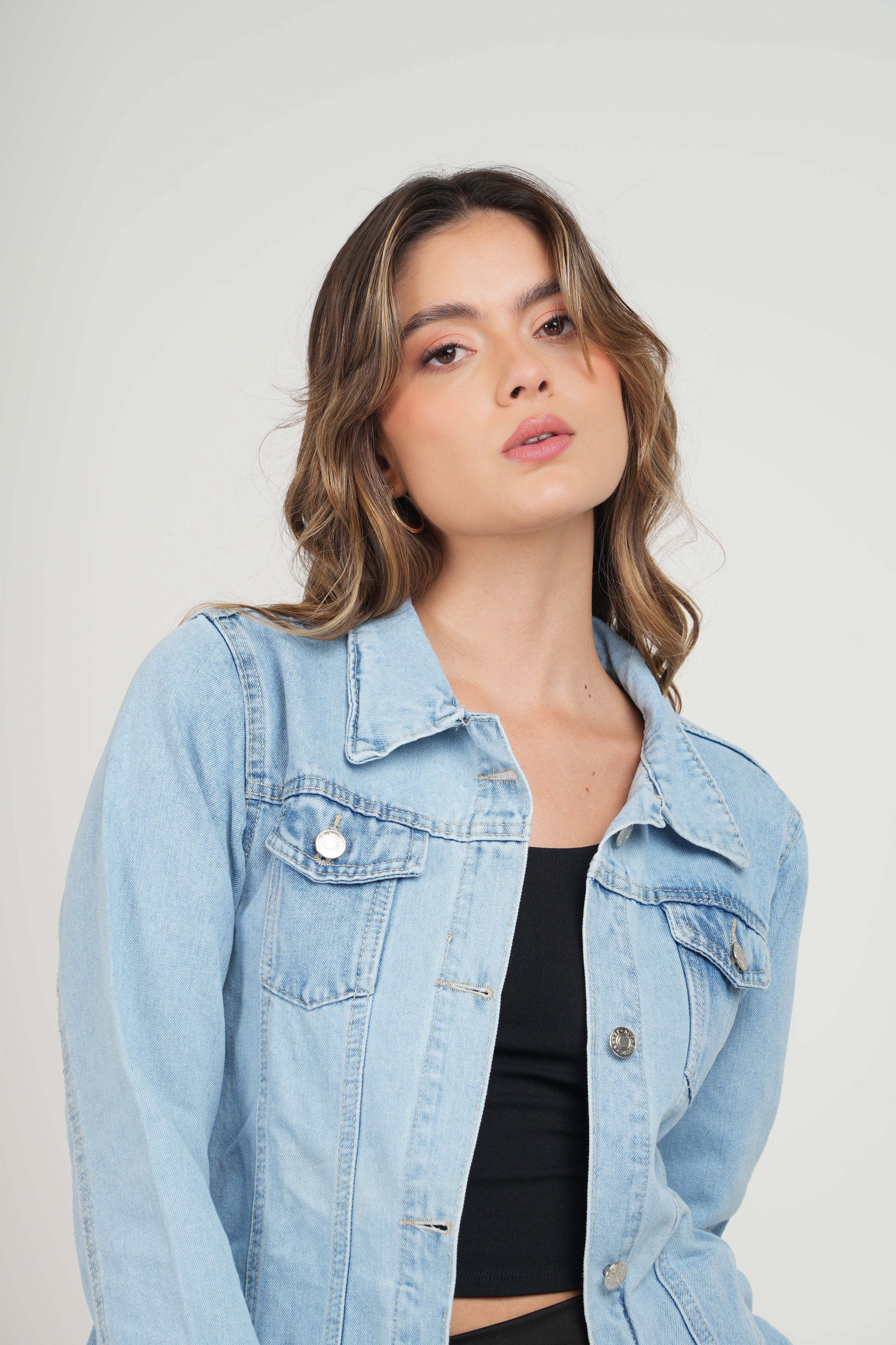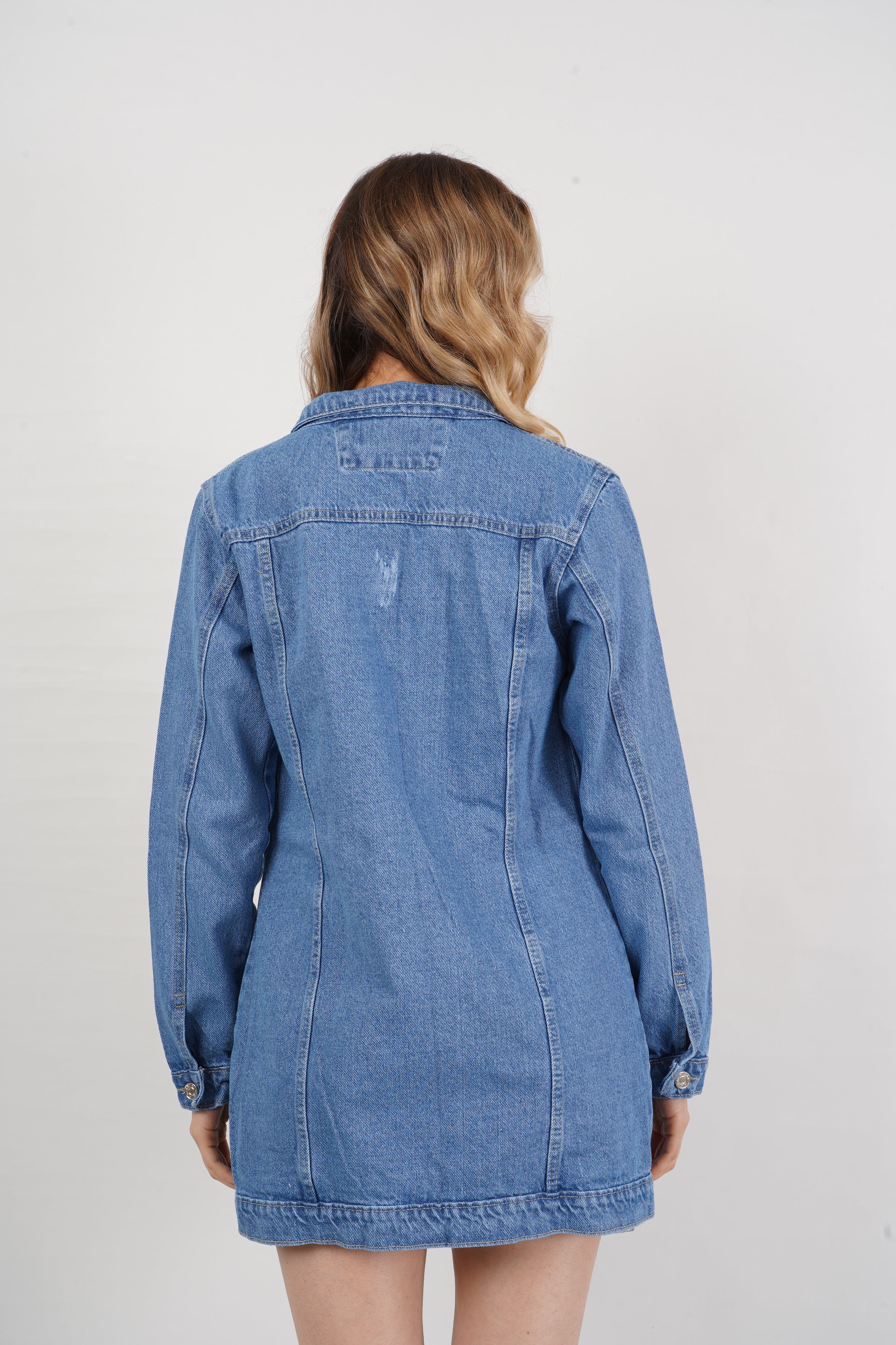 Chaqueta larga de jean para mujer, con botones metálicos y bolsillos frontales. Versátil y moderna, perfecta para looks casuales y urbanos.