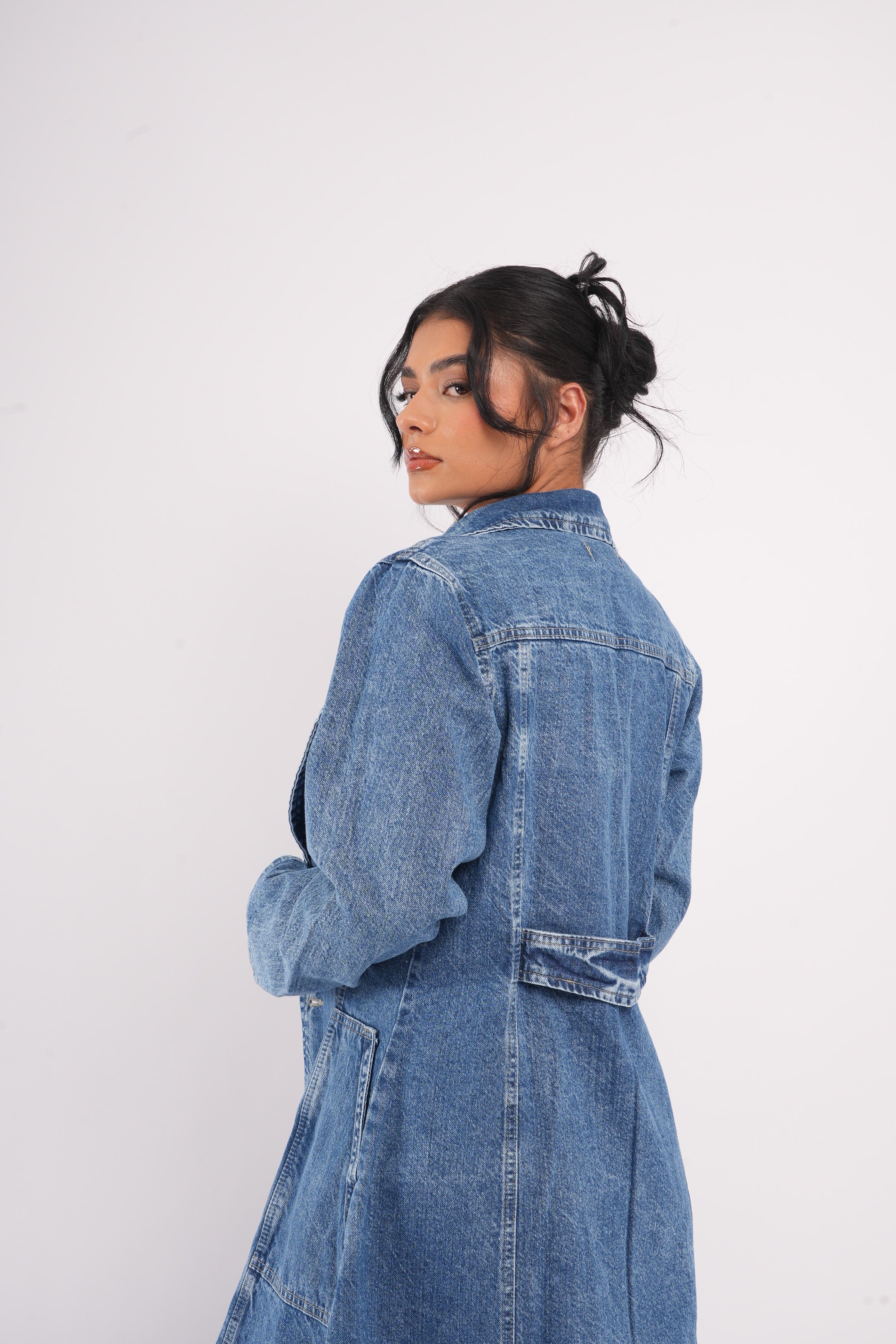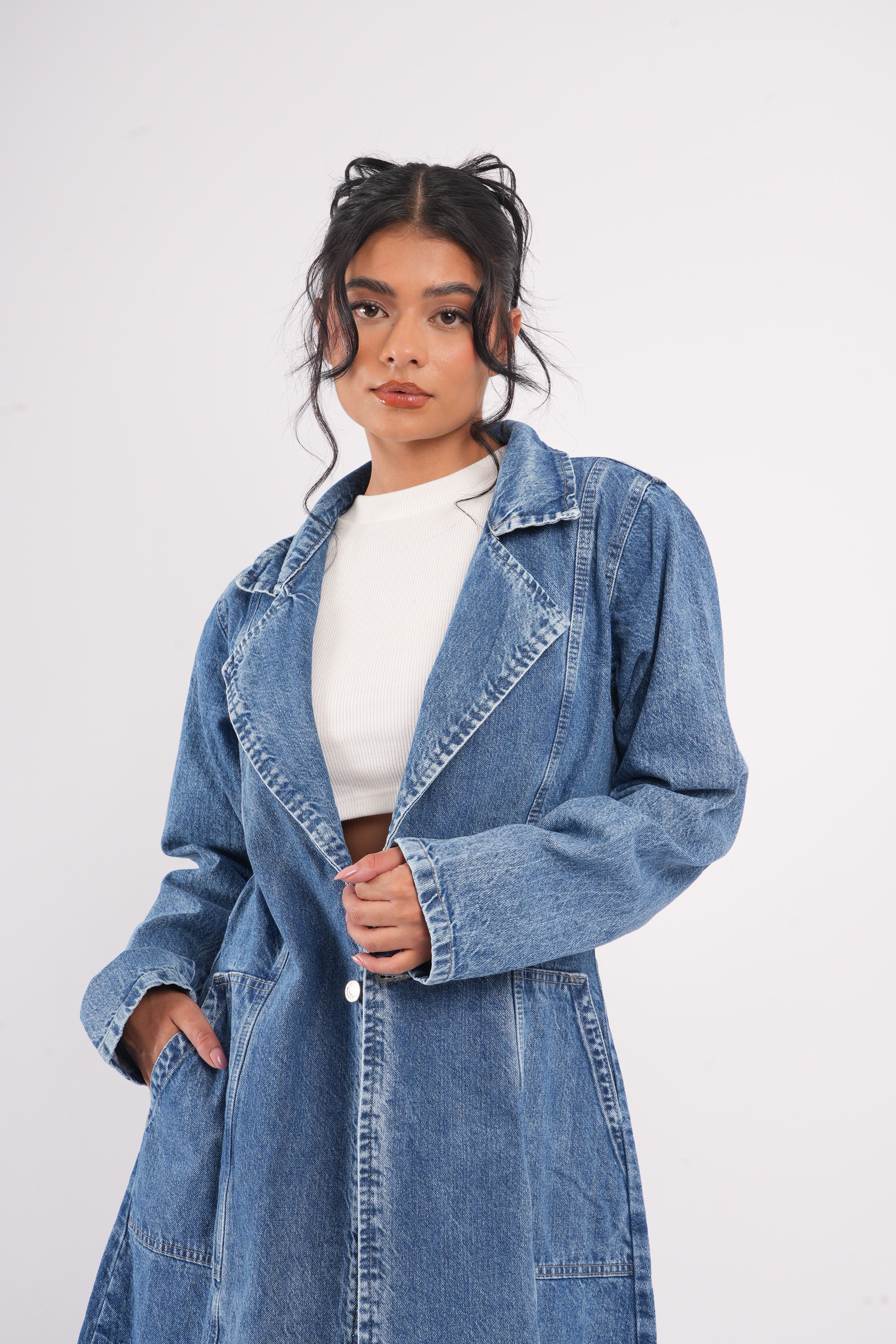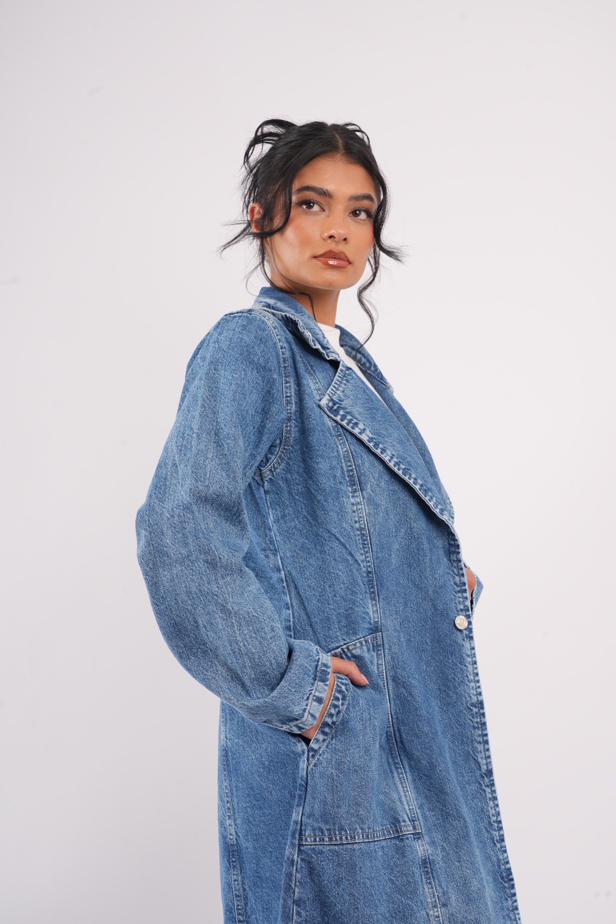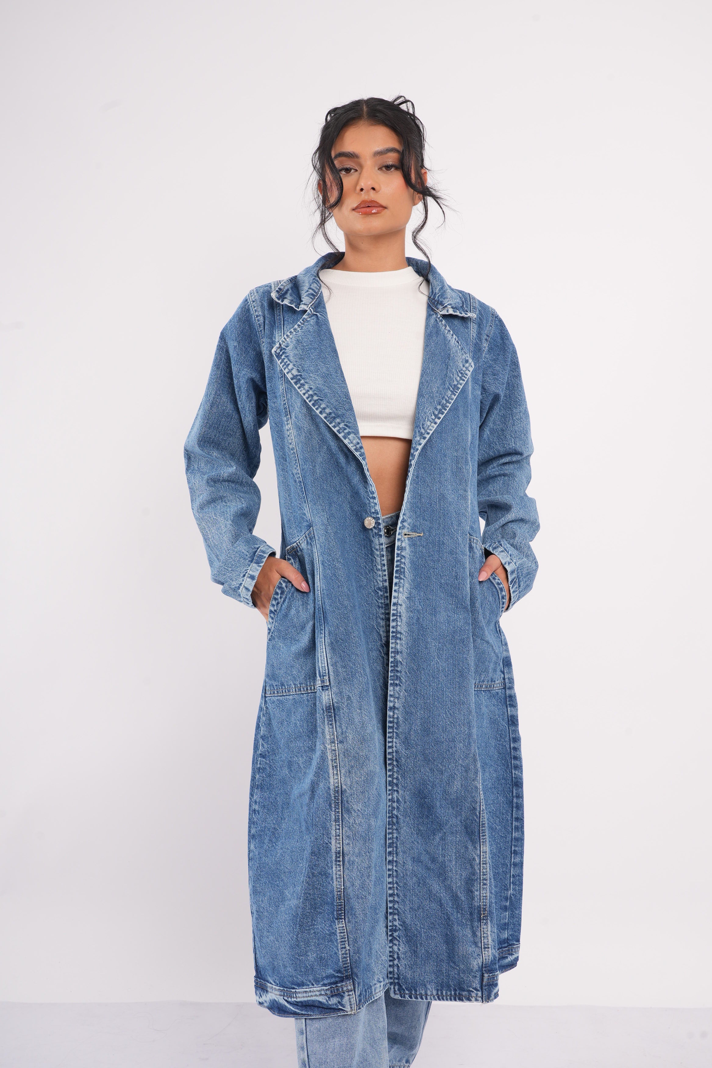 Gabardina Denim Oversize Mujer – Estilo Urbano Atemporal Destaca tu look con nuestra gabardina larga en denim azul medio, una prenda versátil que combina el estilo clásico del mezclilla con un corte moderno y elegante. Su silueta oversize y su diseño abierto la convierten en la aliada perfecta para elevar cualquier outfit, desde jeans hasta vestidos.