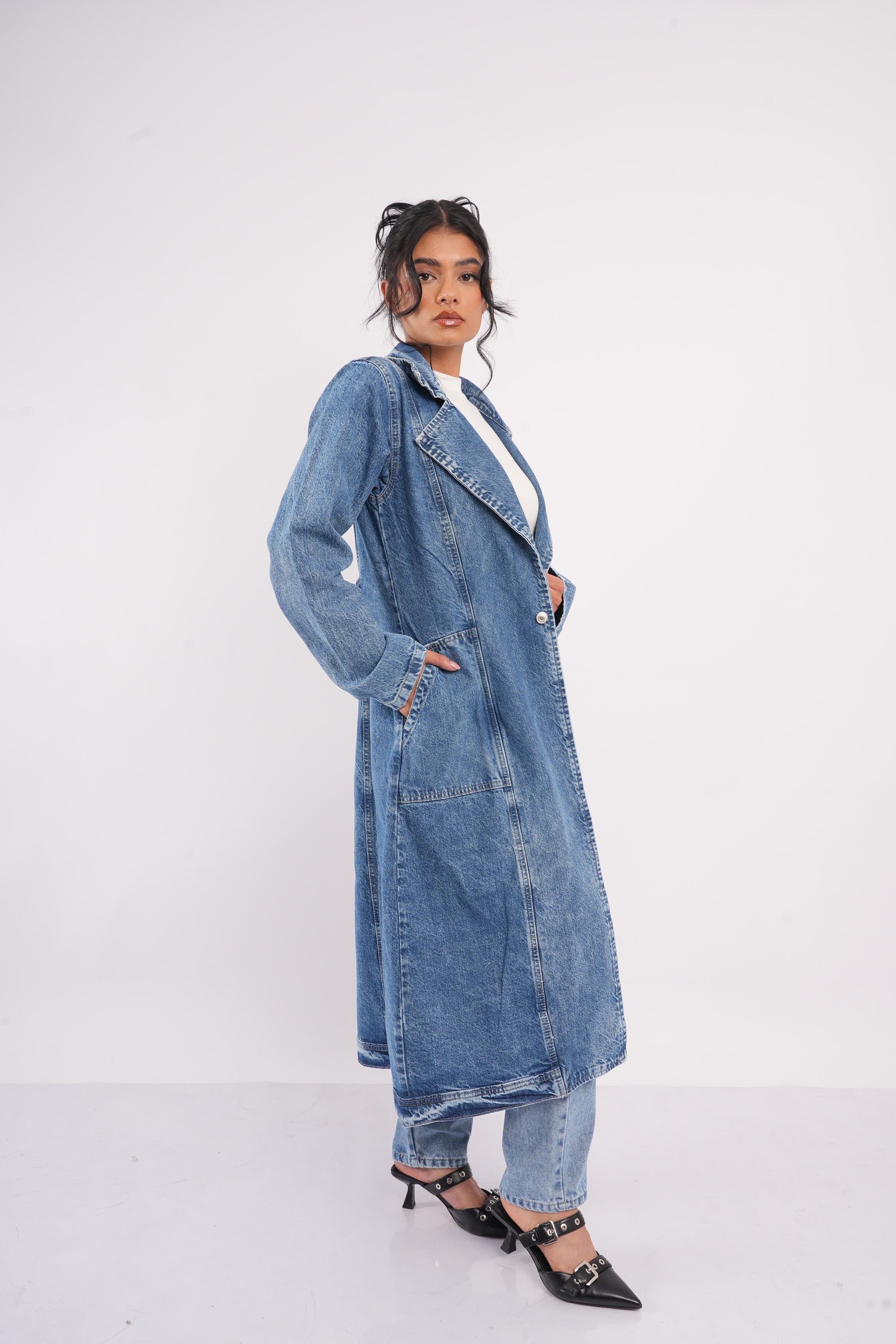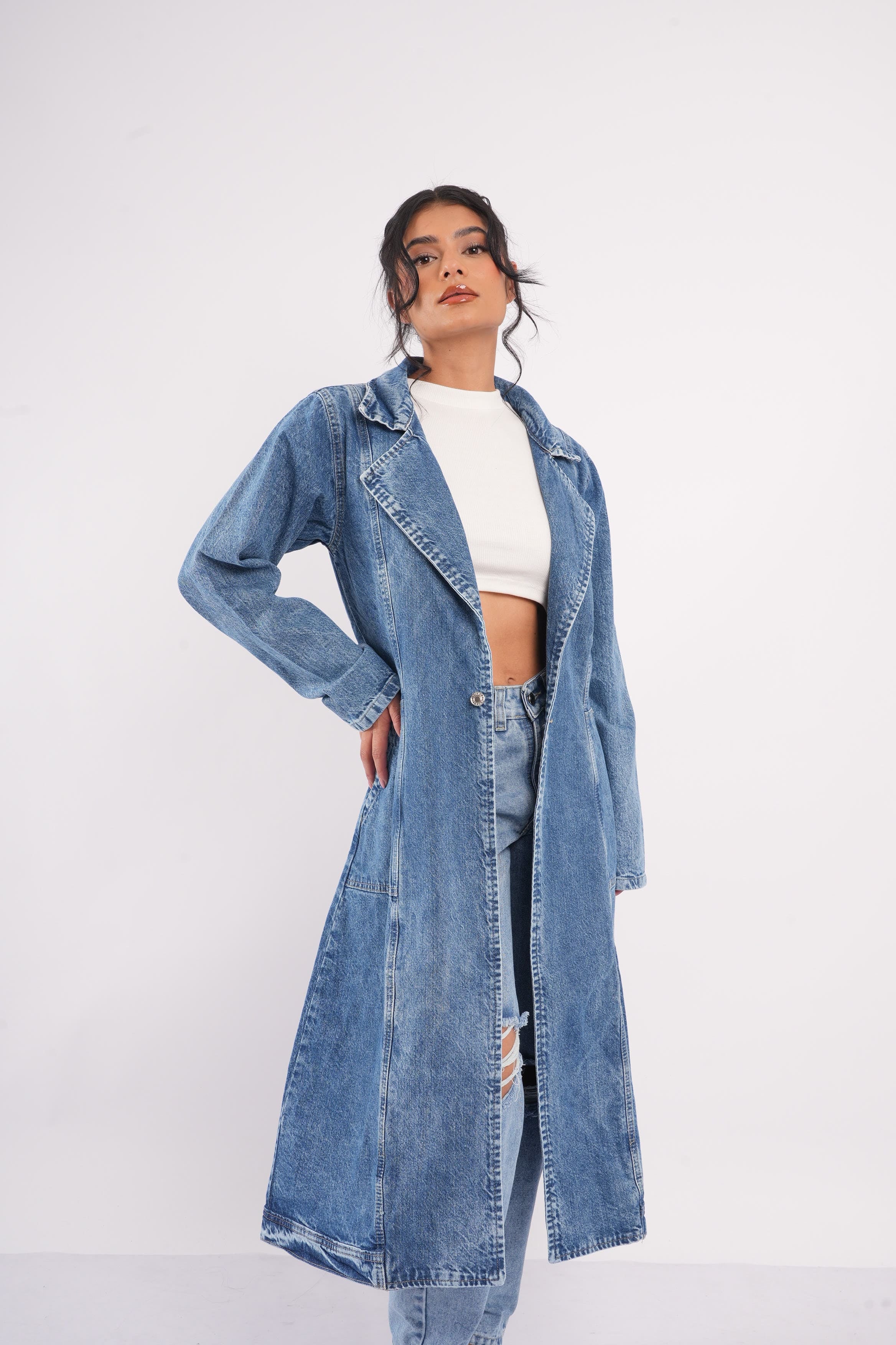 Gabardina Denim Oversize Mujer – Estilo Urbano Atemporal Destaca tu look con nuestra gabardina larga en denim azul medio, una prenda versátil que combina el estilo clásico del mezclilla con un corte moderno y elegante. Su silueta oversize y su diseño abierto la convierten en la aliada perfecta para elevar cualquier outfit, desde jeans hasta vestidos.