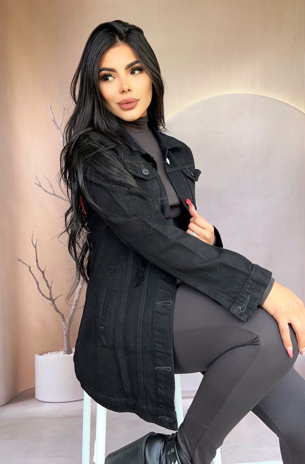 Chaqueta larga estampada de jean para mujer, con botones metálicos y bolsillos frontales. Versátil y moderna, perfecta para looks casuales y urbanos.
