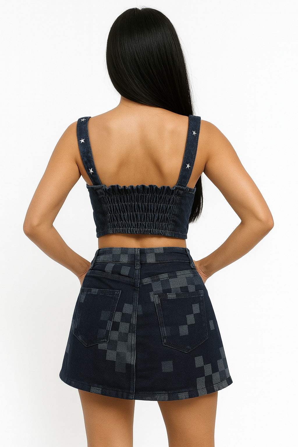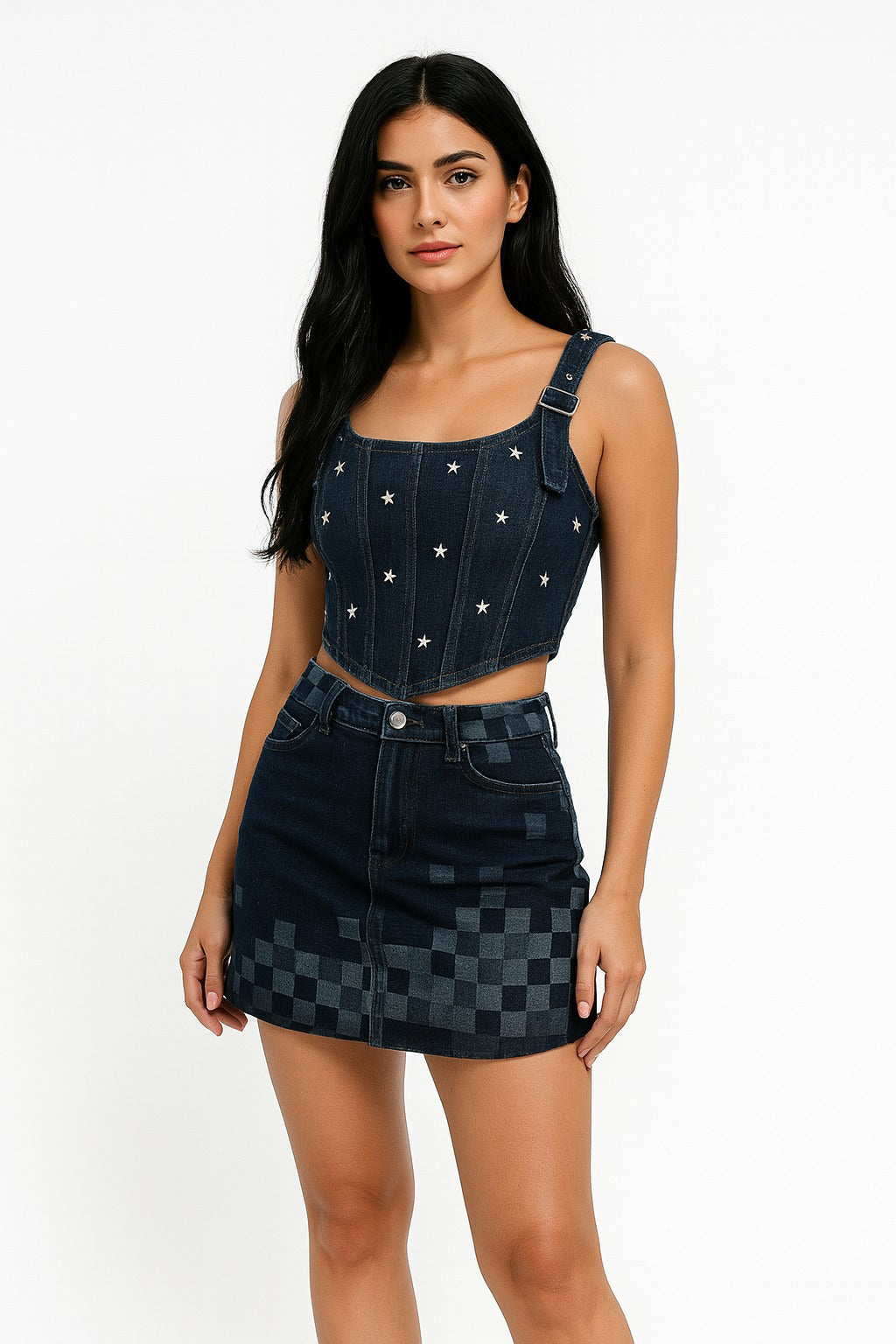 Corset de jean oscuro para mujer con tiras ajustables y taches de estrellas. Diseño moderno y juvenil, ideal para combinar con faldas o jeans.