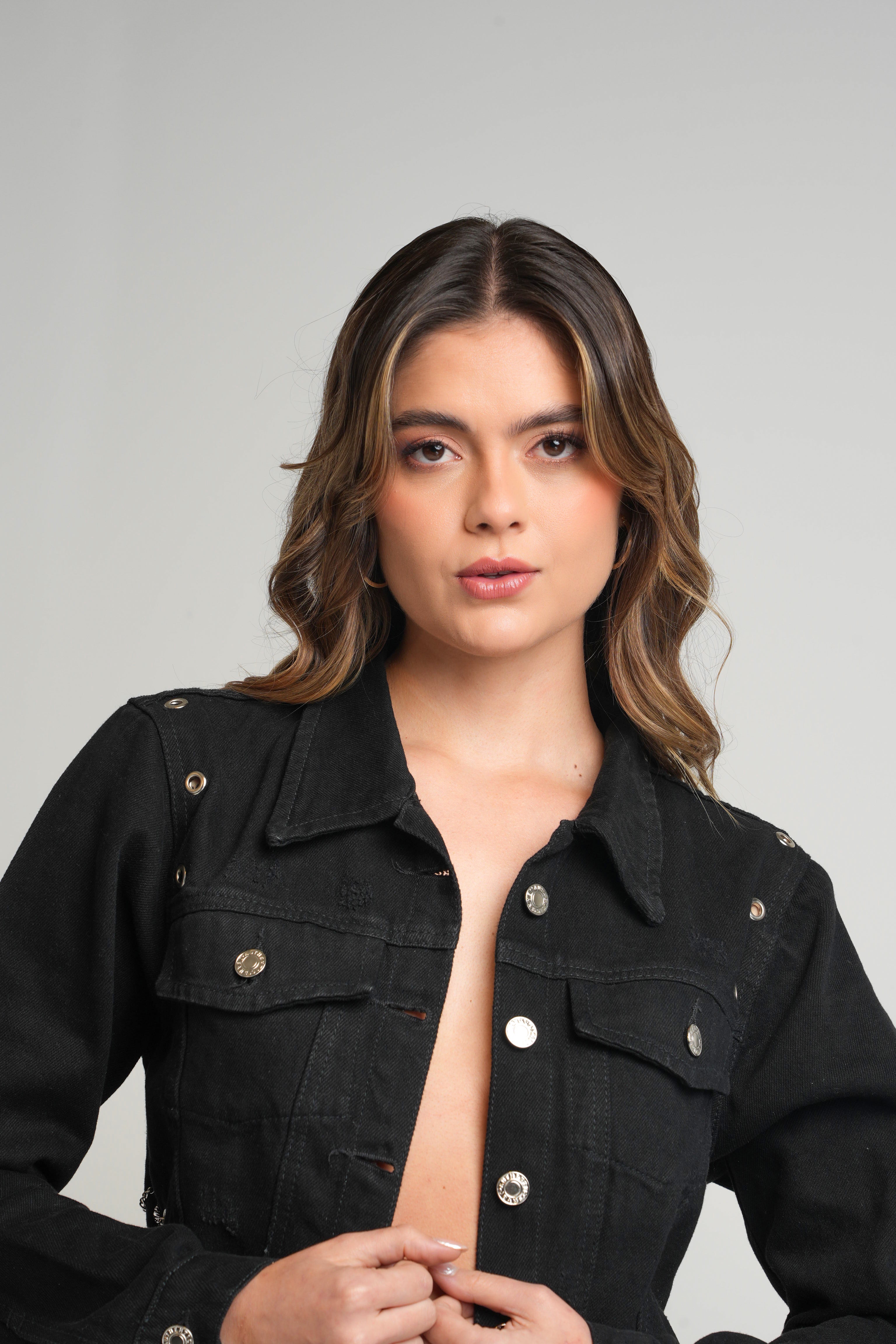 Chaqueta crop de jean para mujer, estilo trucker con detalles desgastados y cadenas laterales. Moderna y urbana, perfecta para un look atrevido.